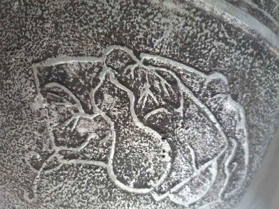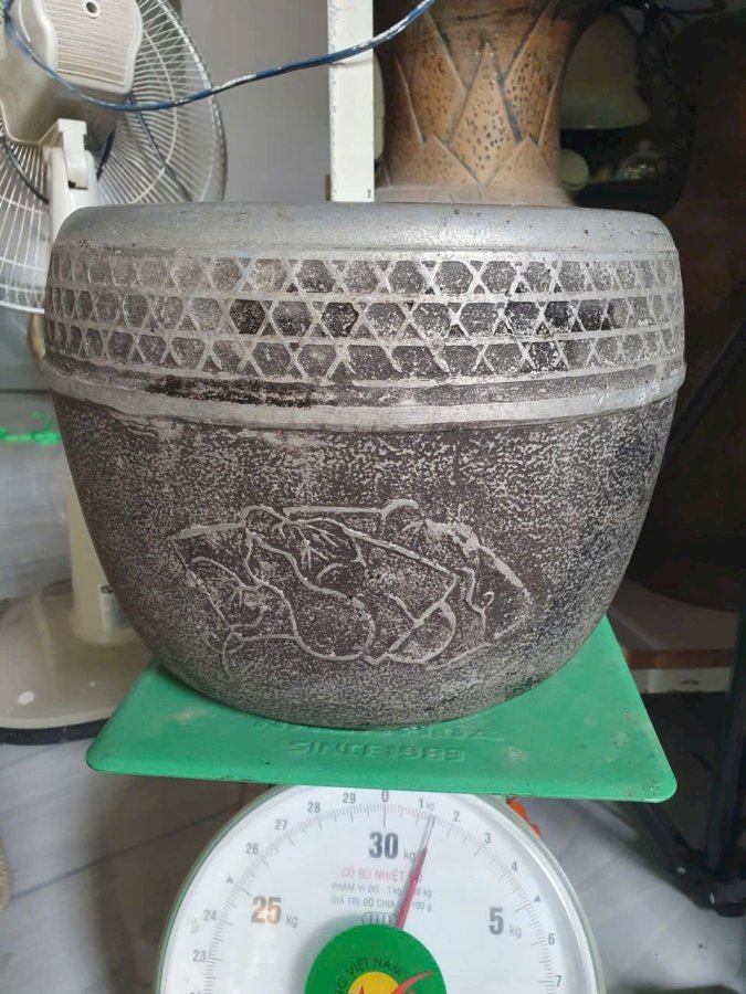 Thống nhôm cổ có hoa văn.Cao 23cm*miệng 28cm*94,5cm.Đáy có 3,4 lỗ thoát nước