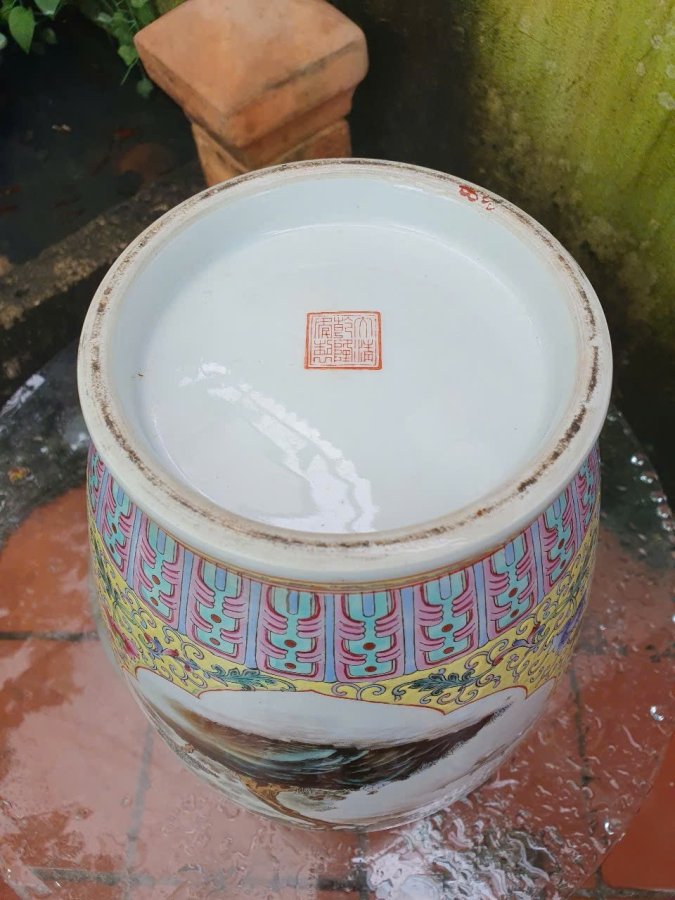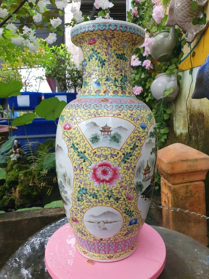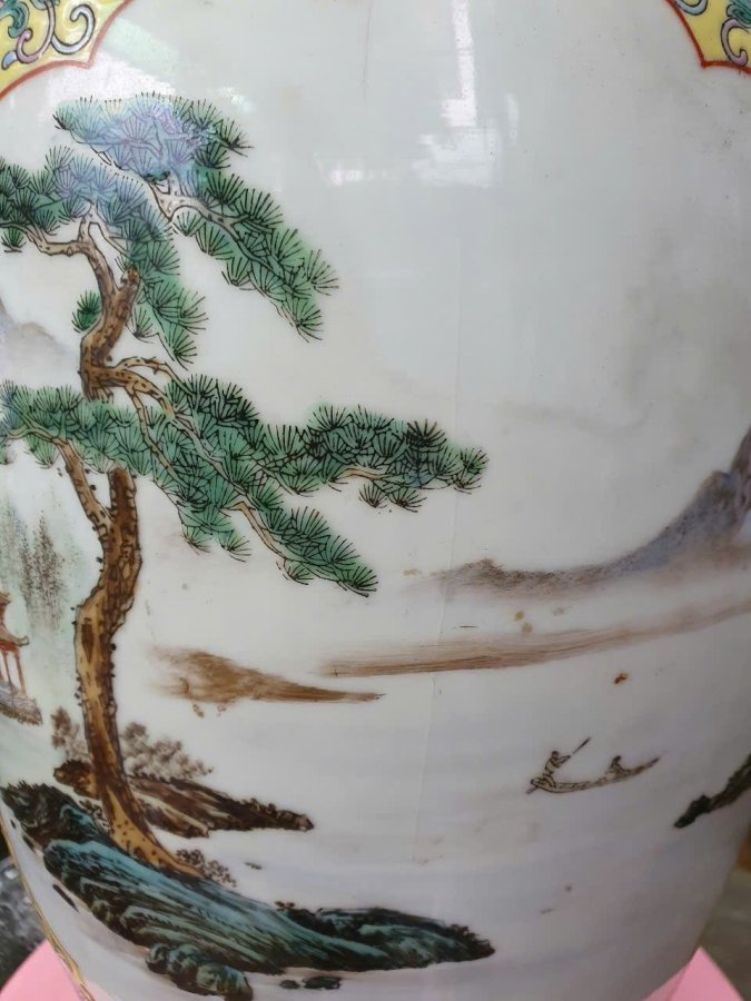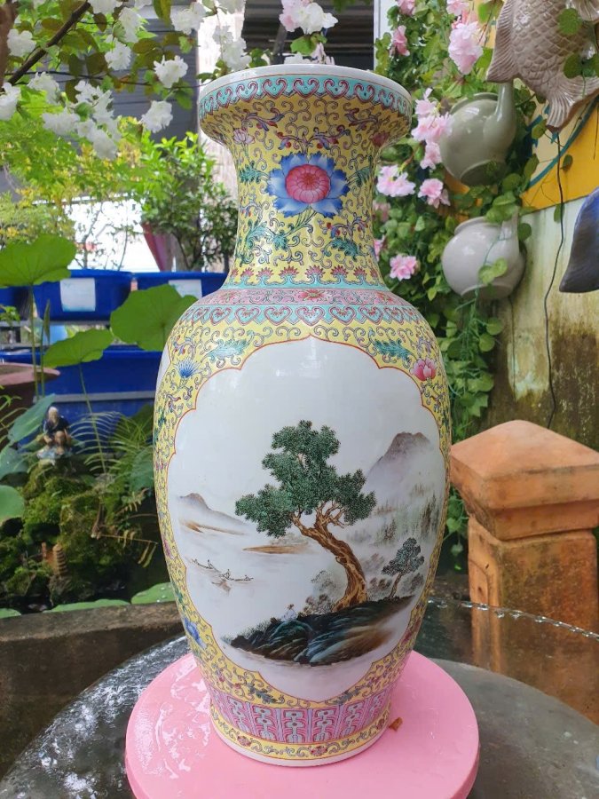 Bình tàu màu vẻ tay bổ ô:" Sơn Thủy Họa Đồ".Cao 67,5cm*15,5cm*vb 70cm.Triện:"Đại Thanh Càn Long niên chế".Có tóc nhẹ men bên ngoài.Đủ tuổi cổ vật.
