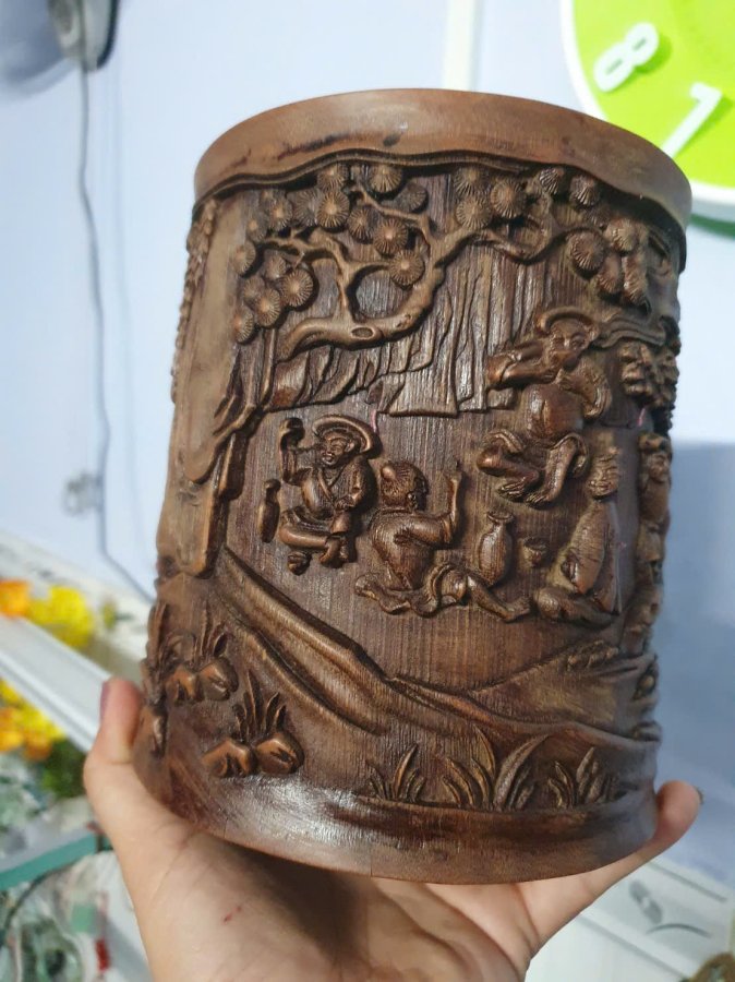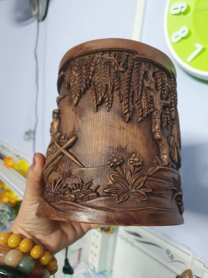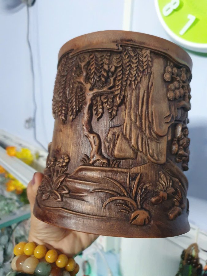 Ống bút bằng măng tre,tích:"Phong thủy hữu tình".Kt 15,8cm*13,5cm.💸3500k