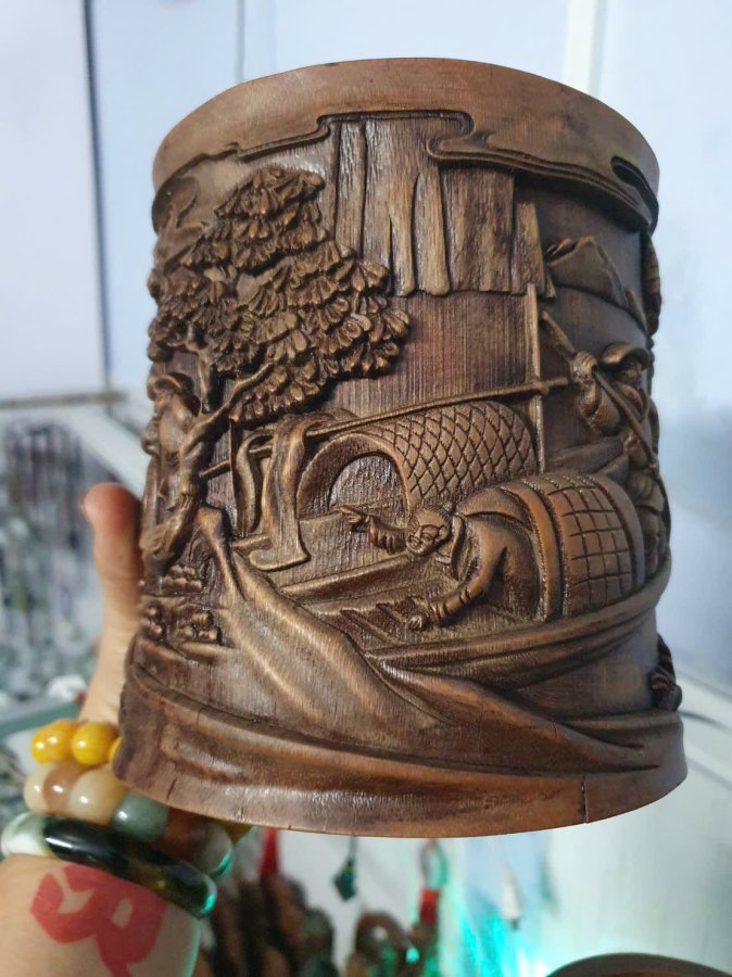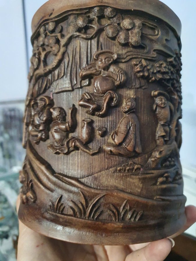 Thời nhà Thanh,tre chạm khắc cẩn thận với phong cảnh, nhân vật, câu chuyện,núi đá cao chót vót, thông bách hùng tráng, nhân vật biểu cảm tự nhiên,cả thể xác lẫn tinh thần,cốt truyện sinh động,chạm khắc chồng chéo có trật tự,lực dao sắc bén nhanh nhẹn,rất biểu cảm,thần thái