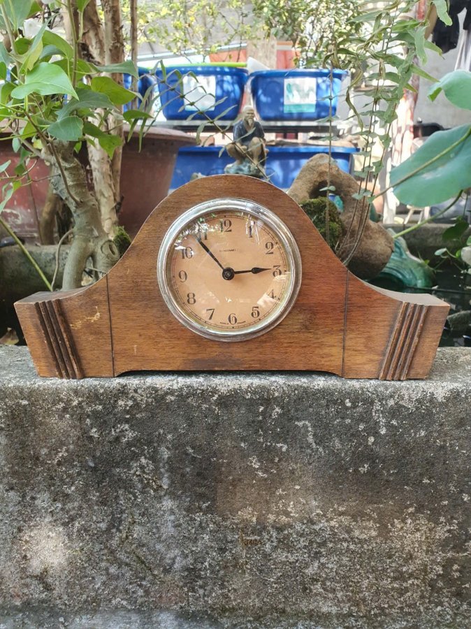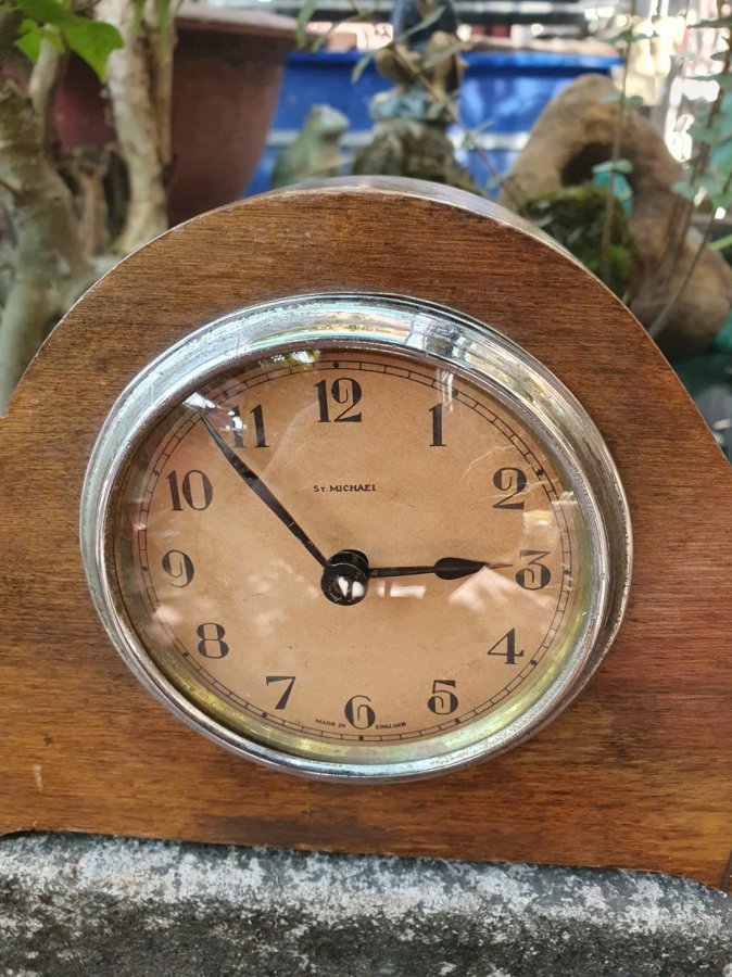 Đồng hồ vai bò cổ điển của Anh Quốc St Michael....đầu thế kỷ 20.Phía sau chụp kỹ,ko còn đồ vặn cót...chạy bình thường,gỗ còn nguyên vẹn.Kt 31cm*45cm*14,5cm.