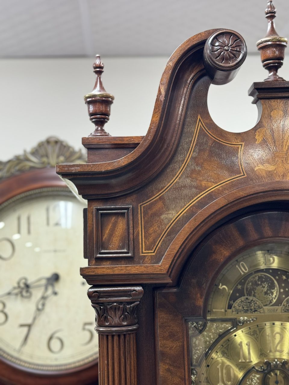 ✨️ Toàn thân gỗ thịt, đầu chạm khắc gỗ chìm, đồng hồ được chạm cặp trụ phối họa tiết đồng cây đồng hồ trông cực mạnh mẽ và trang trọng