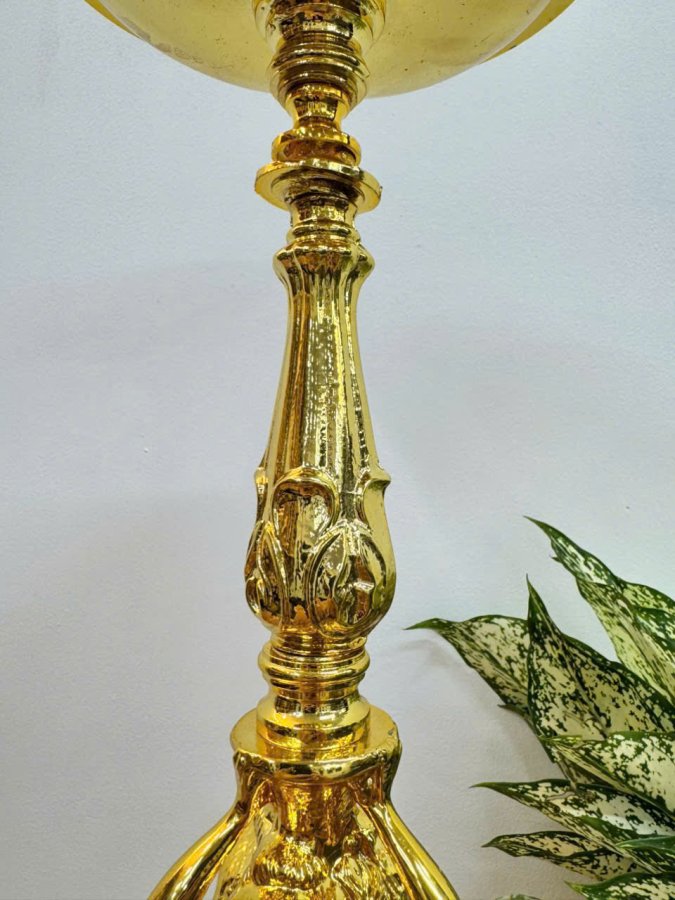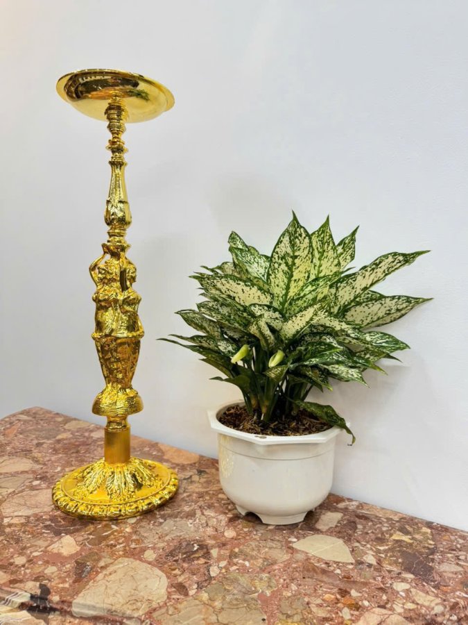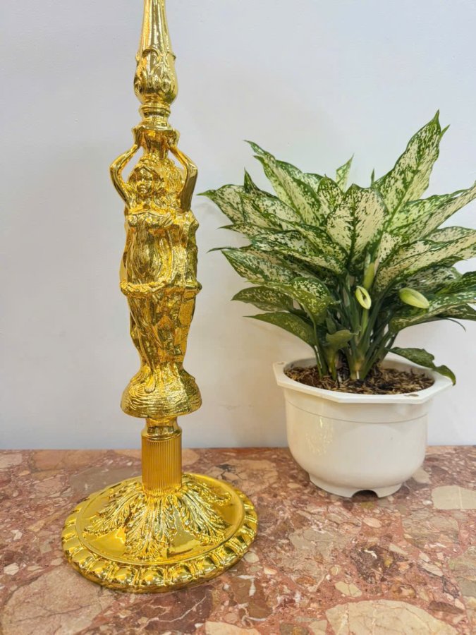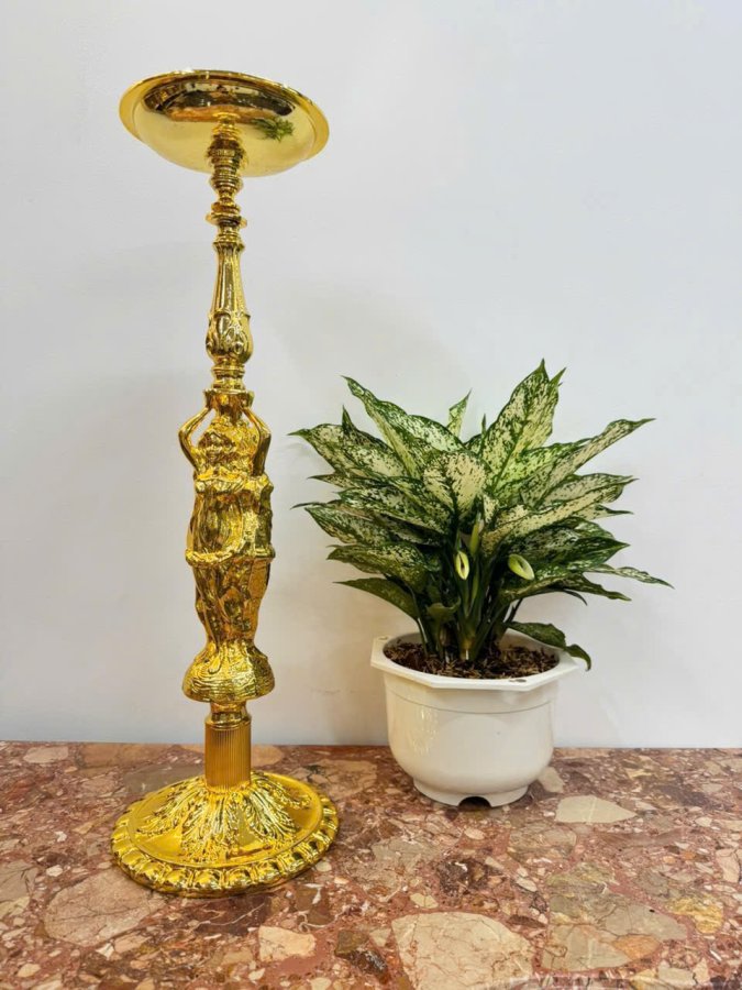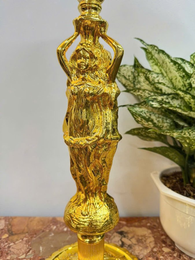 Chiếc khăn tàn tàn mang phong cách Châu Âu cổ điển nổi bật với biểu tượng thiếu nữ bằng đồng xu kê vàng sắc nét. Các đường đúc tinh, ánh vàng sang trọng, vừa mang giá trị nghệ thuật, vừa tạo điểm nhấn nổi bật cho không trưng bày.