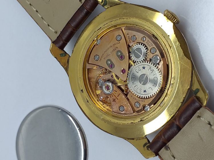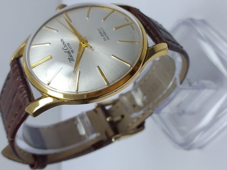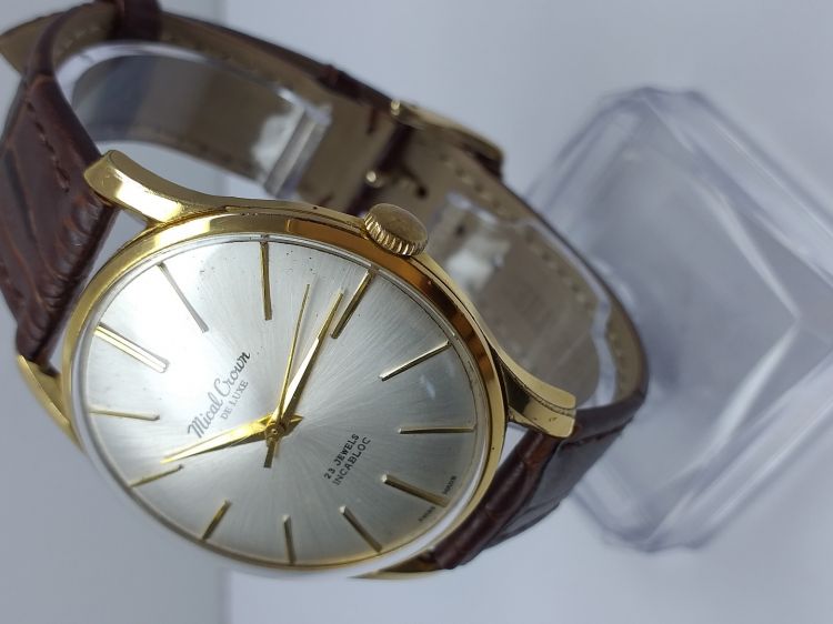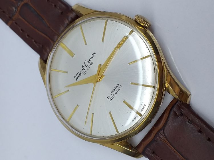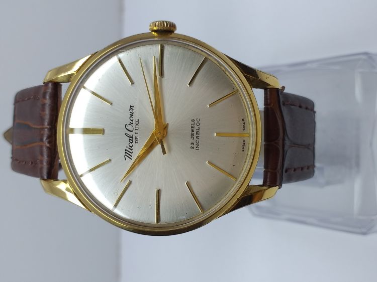 - Mical Croun Dulexu. - Máy lên dây 23 jewels Incabloc. - Mặt zin tia, kính meca zin. - Vỏ bọc vàng mòn phần đáy như hình. - Size to: 37,5 (ko tính núm). - Giá call: 0908.756695 - Tuan Anh.