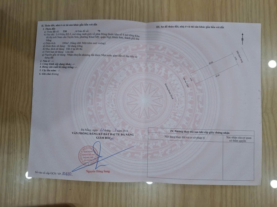 Bán Đất đường Đoàn Khuê rộng 11,5m lề mỗi bên 5m,Lô đất nằm trong dự án khu Nam Việt Á,thuộc phường Ngũ Hành Sơn, Đà Nẵng .Diện tích: 5x20=100m2. Hướng:Tây, giá:9,5 tỷ.Tặng giấy phép xây dựng nhà 2 tầng.