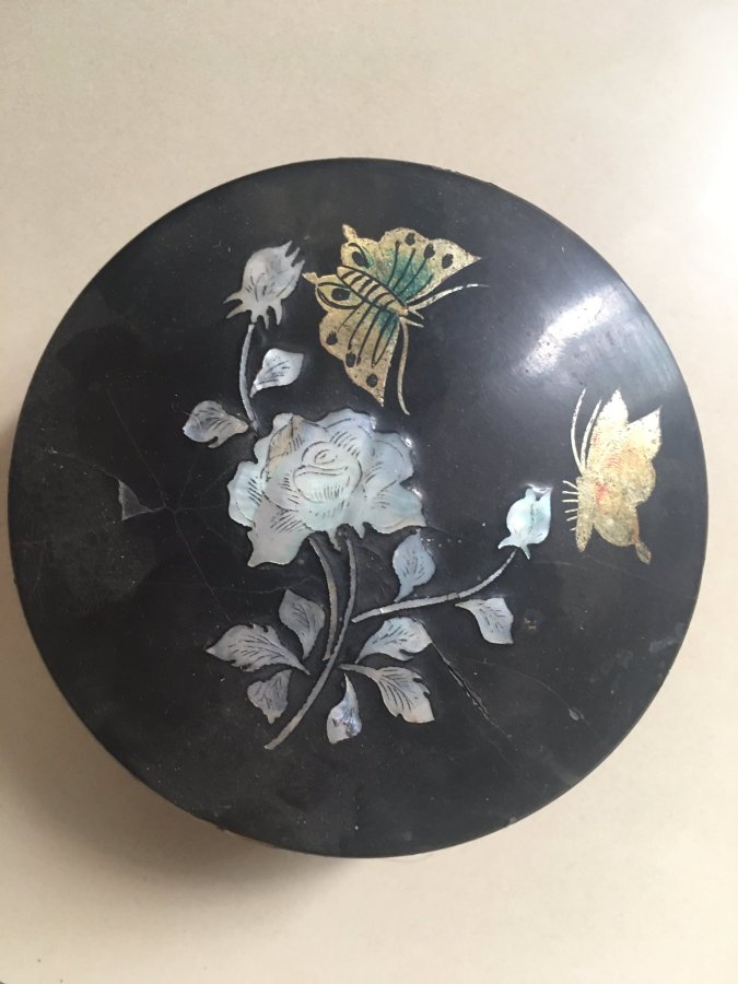 Hộp trà sơn mài khảm trai hoa bướm, cẩn kỹ thuật, nét đẹp: 150k+25k ship.