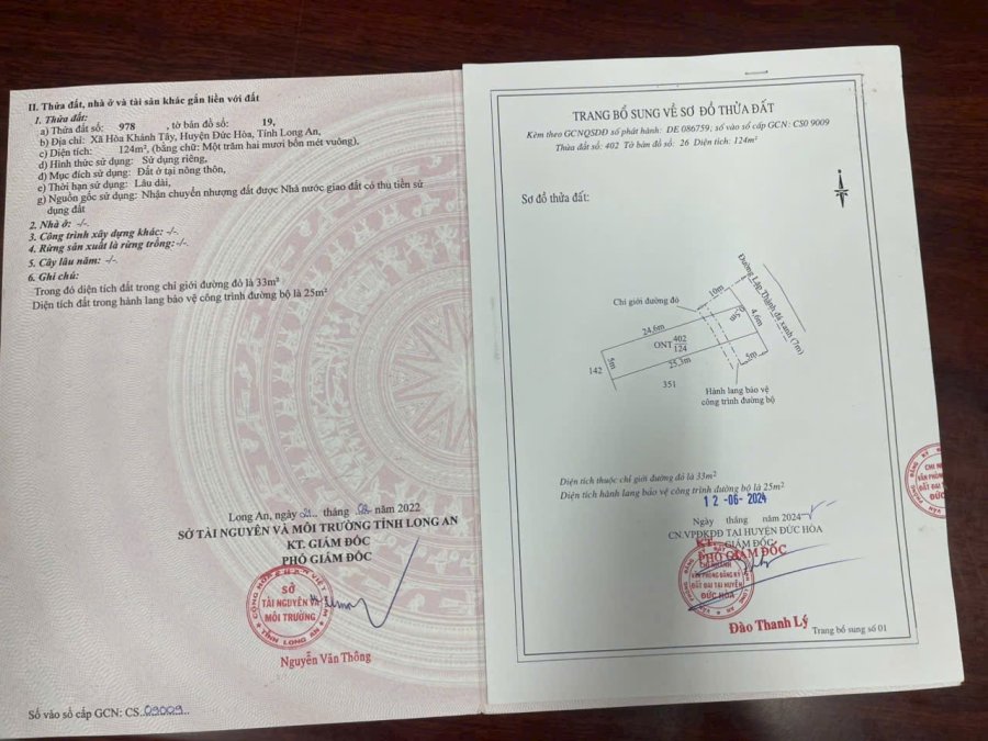 Chủ cần bán lô đất thổ tại ấp Lập Thành , xã Hòa Khánh Tây , huyện Đức Hòa Long An Diện tích 5x25 full thổ , sổ hồng riêng,mặt tiền nhựa đang thi công 7m một vị trí đẹp cho nhà đầu tư nhựa đang khởi công Giá 1 tỷLH 0977388511 zalo