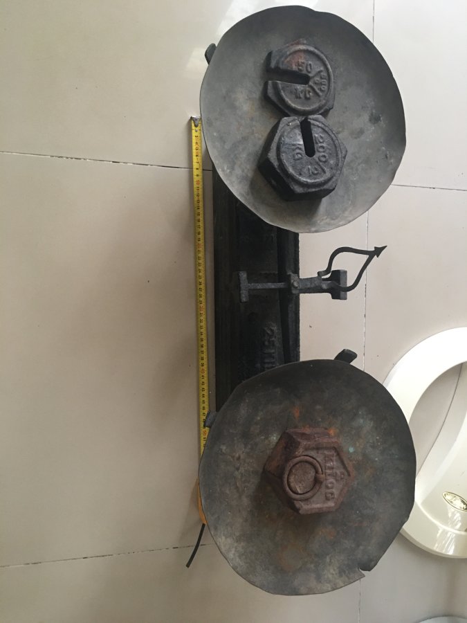 Cân xưa 25kg, 2 mâm đồng đk 28cm, 3 quả cân 5kg: 1,2 triệu