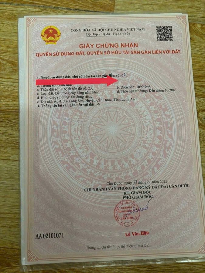 Dt : 1500m2 ( 65,6 x 44.63) gồm 400m2 thổ cư + 1100 m2 đất vườn , xã Long Sơn , Cần Đước Long An. Đất đẹp nền cao ráo