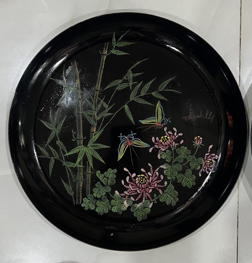 2 dĩa Sơn mài khắc Thành Lễ xưa Đk: 30cm