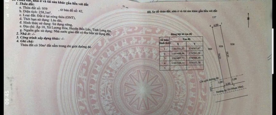 Chủ gửi bán 258m² thổ cư Mt đường nhựa Ấp 10 .