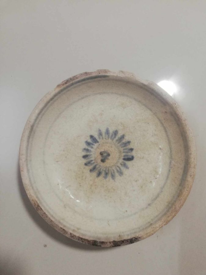Đĩa Chu Đậu chân cao, TK 15, đk 12cm, viền có vảy, vẽ hoa cúc.: 850k+50k ship.