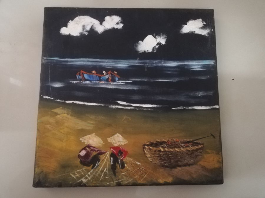 Tranh sơn dầu bắt cá kích thước 30x30cm. 200k+40k ship.