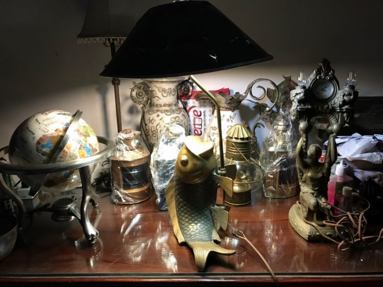 +toàn thân bằng đồng đặc rất dày và chắc chắn, sử dụng điện 110v với 2 bóng rất sáng, có thể thay thế bóng led từ 1-3W Việt Nam để tiện dùng 220v, với đỉnh chóp giữ Chao hình vảy Cá, hoạt động tốt, made in USA.
