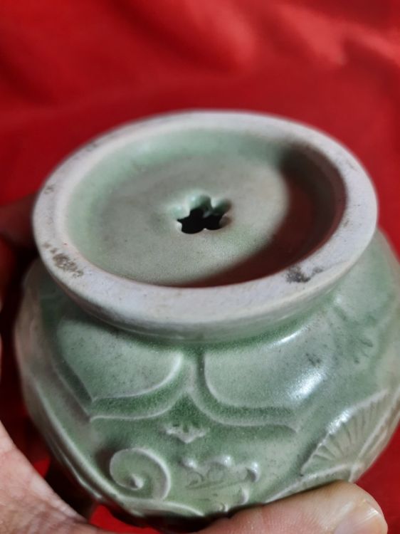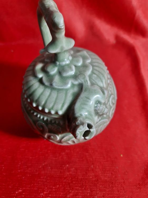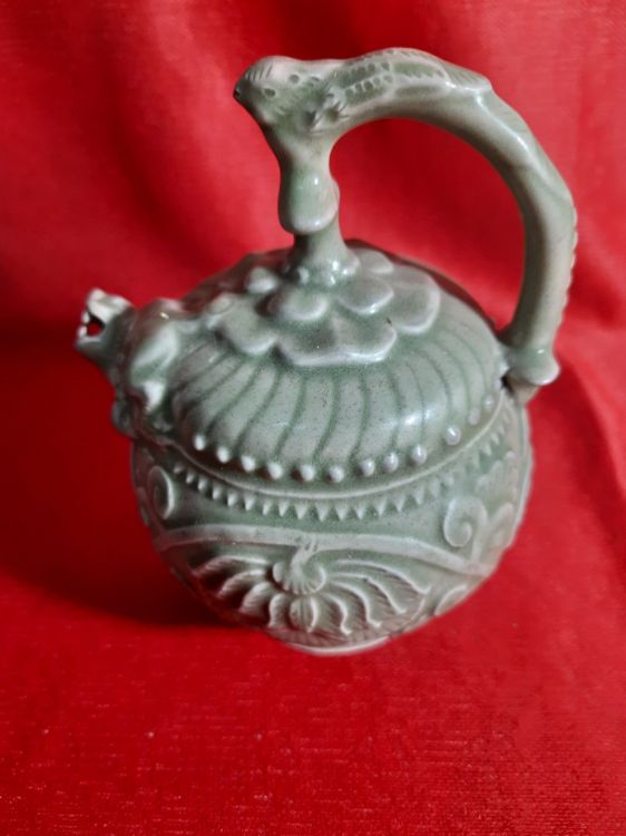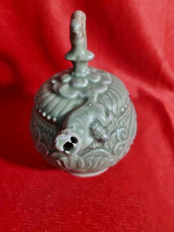Ấm celadon đắp nổi lân, tích thượng cầm hạ thú