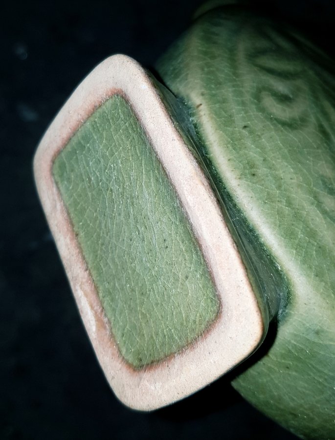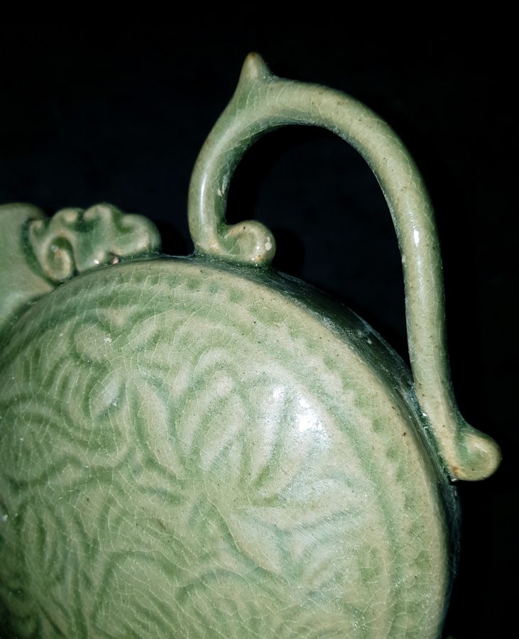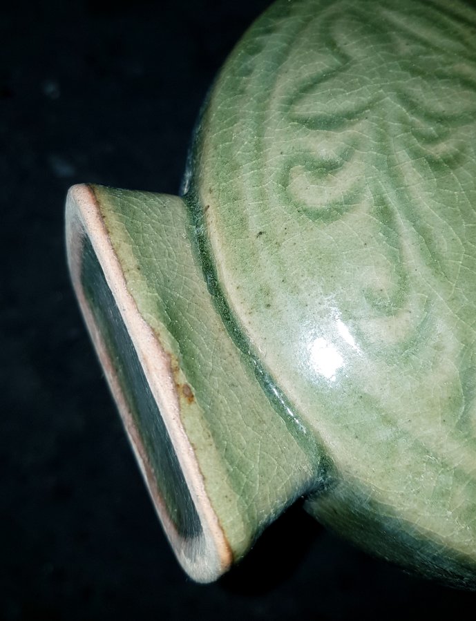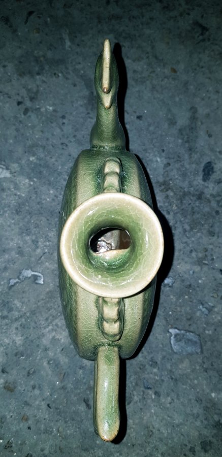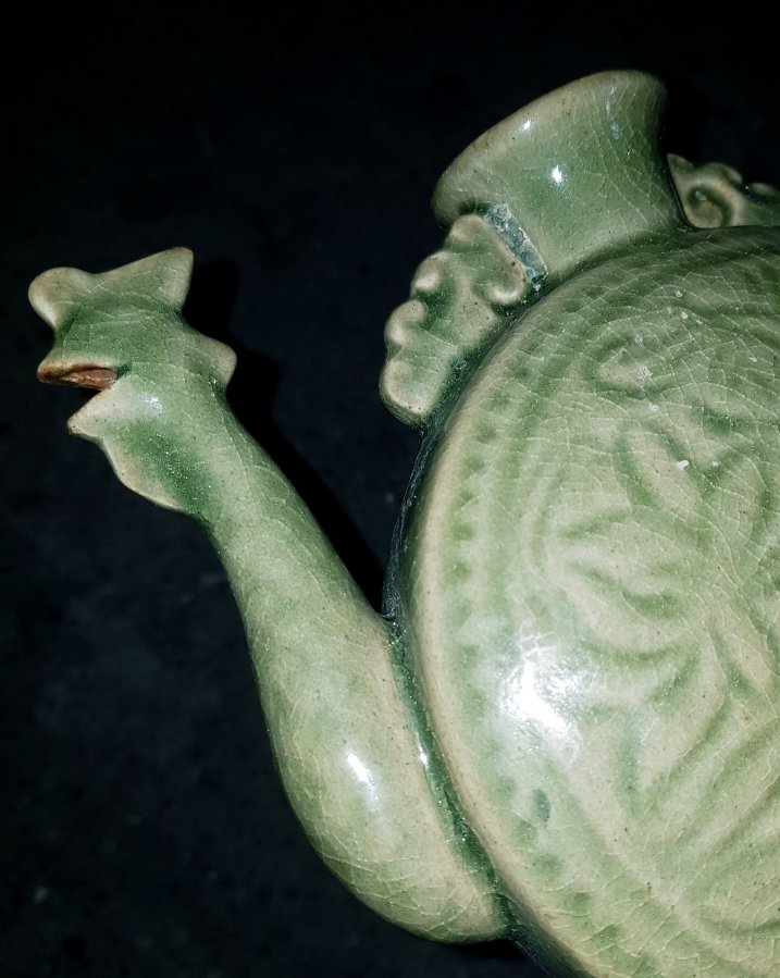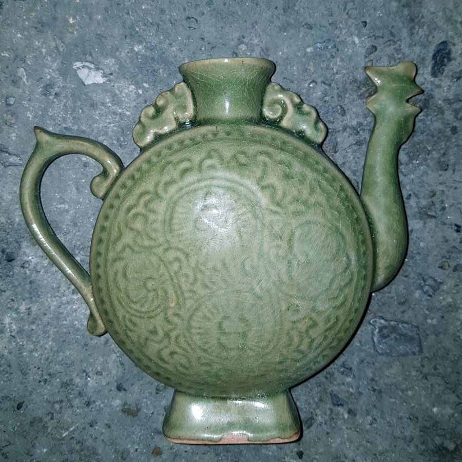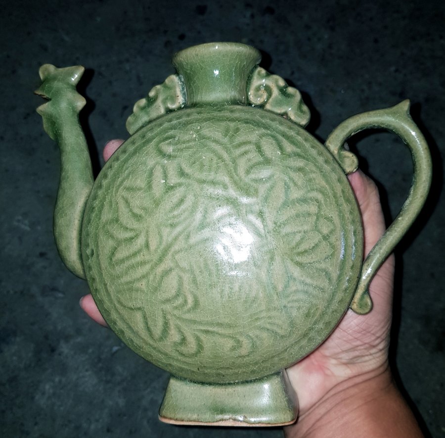 Ấm đầu gà dáng đồng hồ Celadon men ngọc có ám họa , ấm lành lặn có tổng chiều cao 17.5cm. ngang rộng nhất 20cm. Miệng 4.5cm. GL1550k