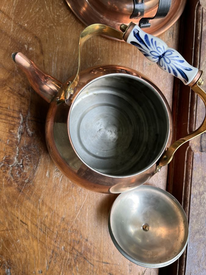Ấm Hà Lan đồng đỏ với phần núm nắp ấm và quai cầm trang trí với Gốm sứ men Lam