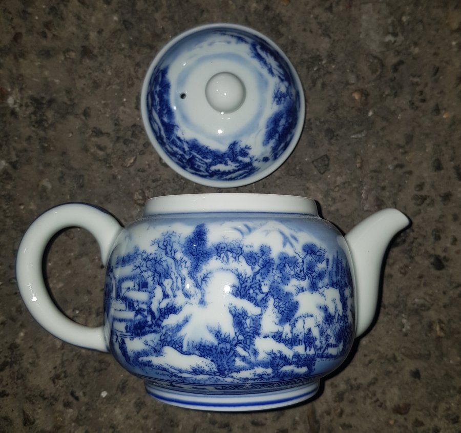 Ấm sứ men lam chàm hồi họa pháp tơ tóc tỉ mỷ vẽ sơn thủy kín xung quanh. Sen lẫn sơn thủy là các vị tiên nhân vân du thưởng ngoạn. Ấm dung tích khoảng 250ml. Lành lặn. GL790k