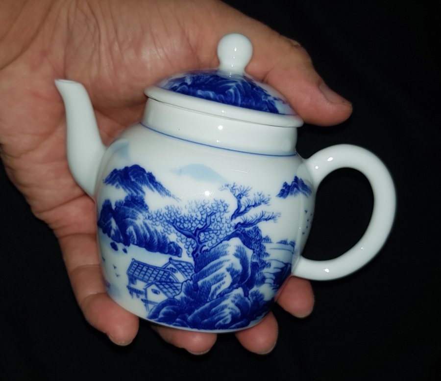 Ấm sơn thủy dung tích nhỏ chỉ khoảng 200ml với dáng ấm cao khỏe và men chàm tươi nổi bật cùng với đó là cao lanh tinh trong vắt.GL790k