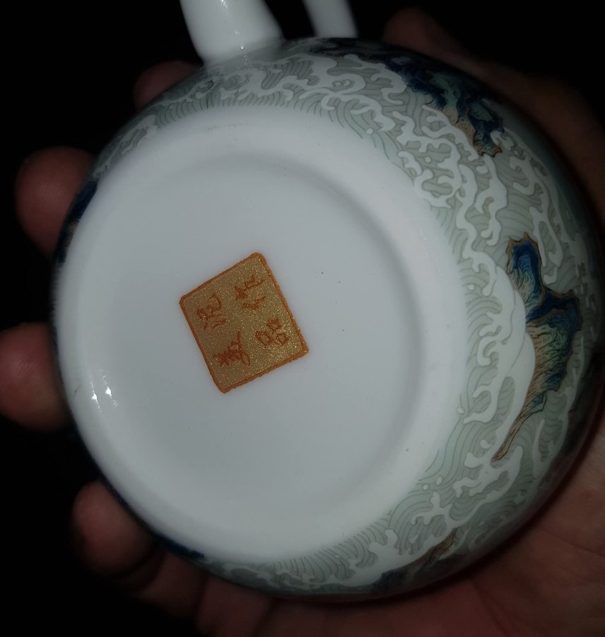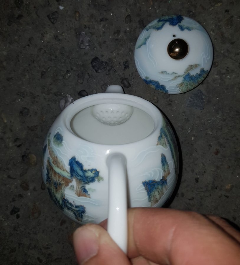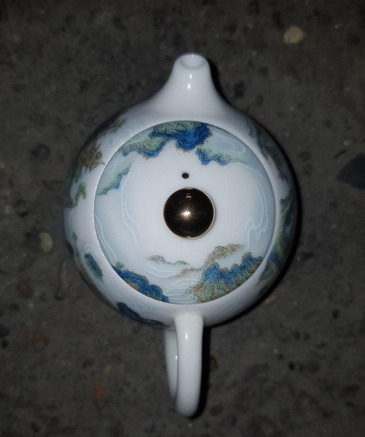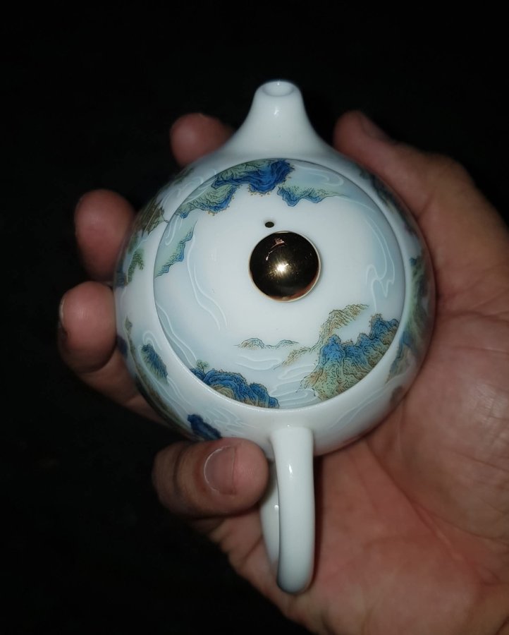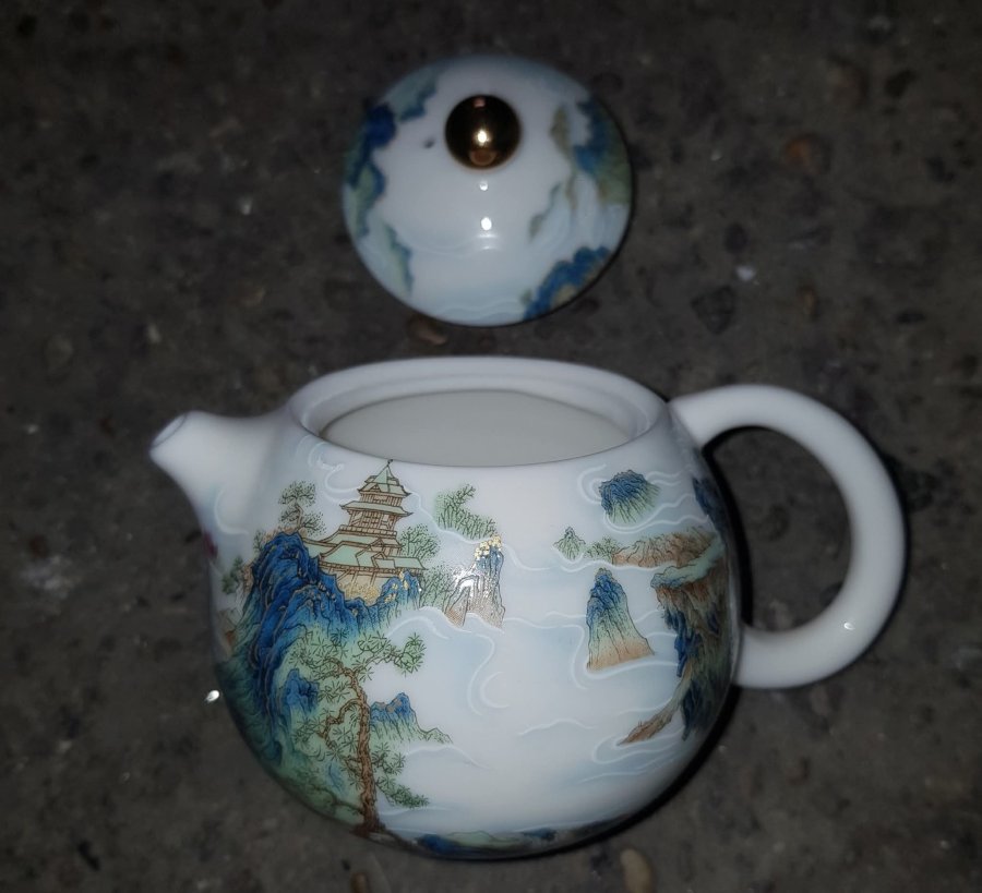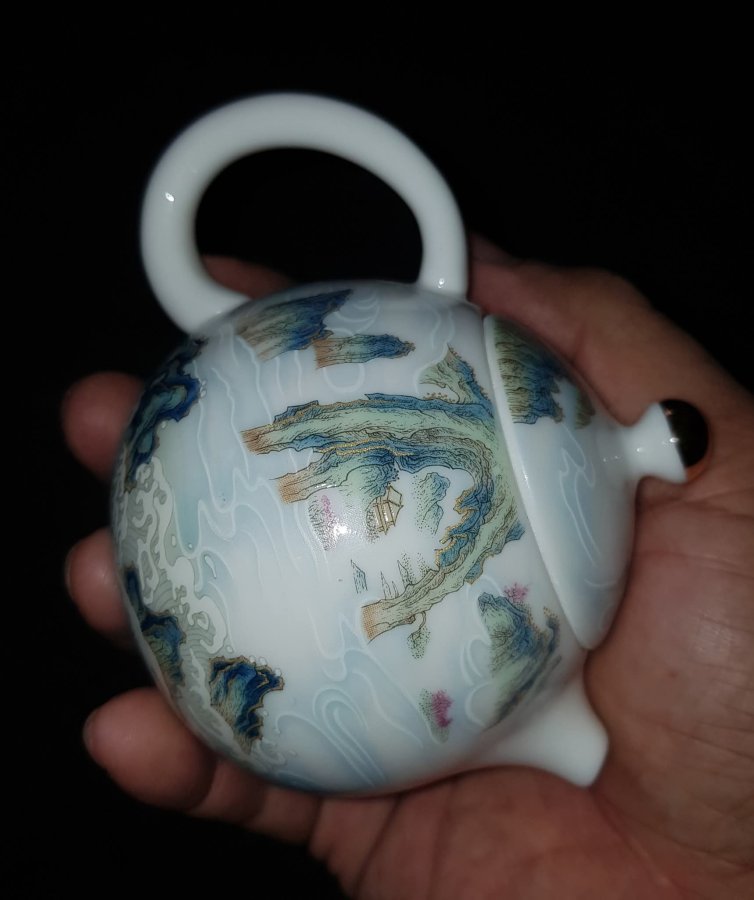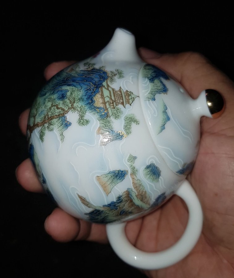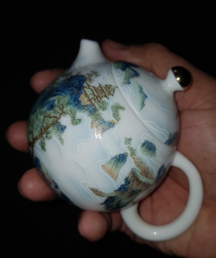 Ấm sứ mini họa pháp nổi sơn thủy tùng đình với những dãy núi hàng hàng lớp lớp sen kẽ nhau tạo nên sự hùng vỹ của tự nhiên. Ấm dung tích chỉ khoảng 165ml. GL790k