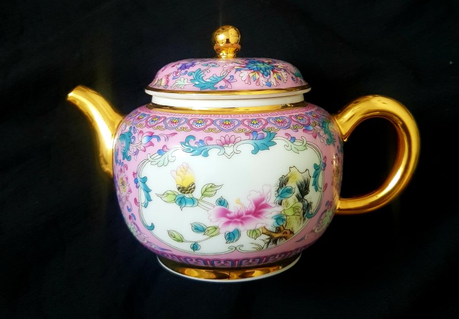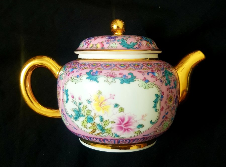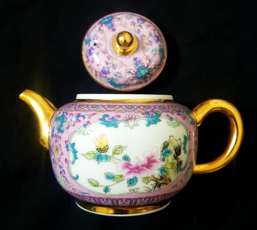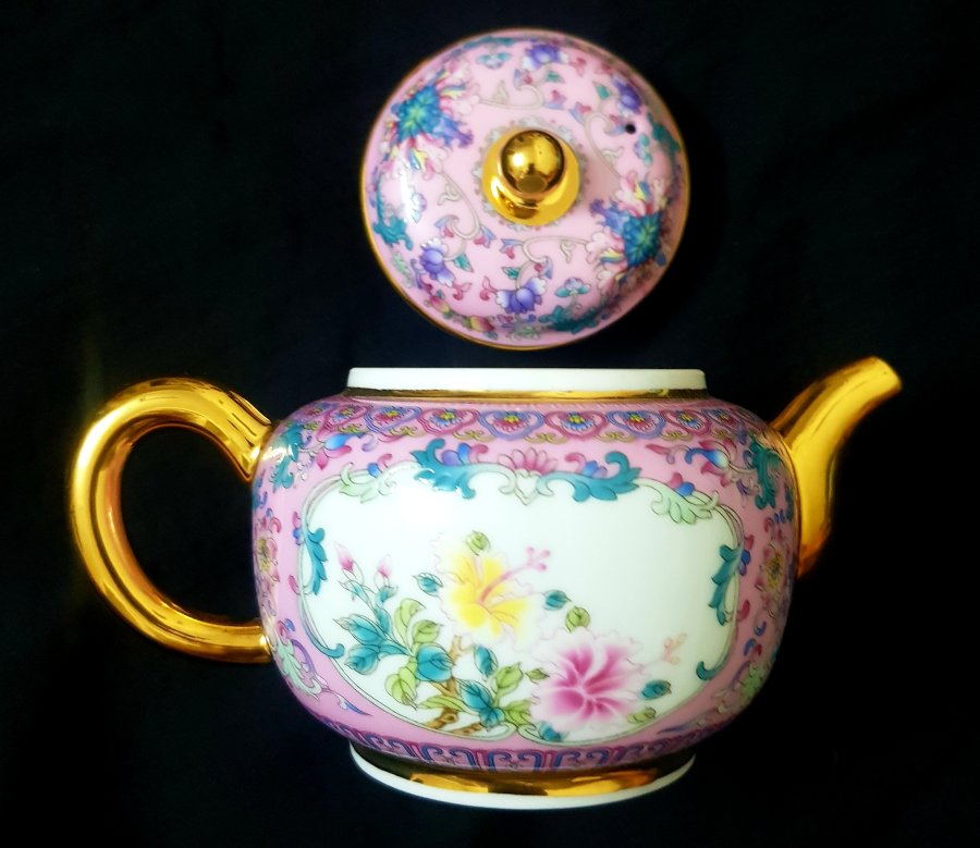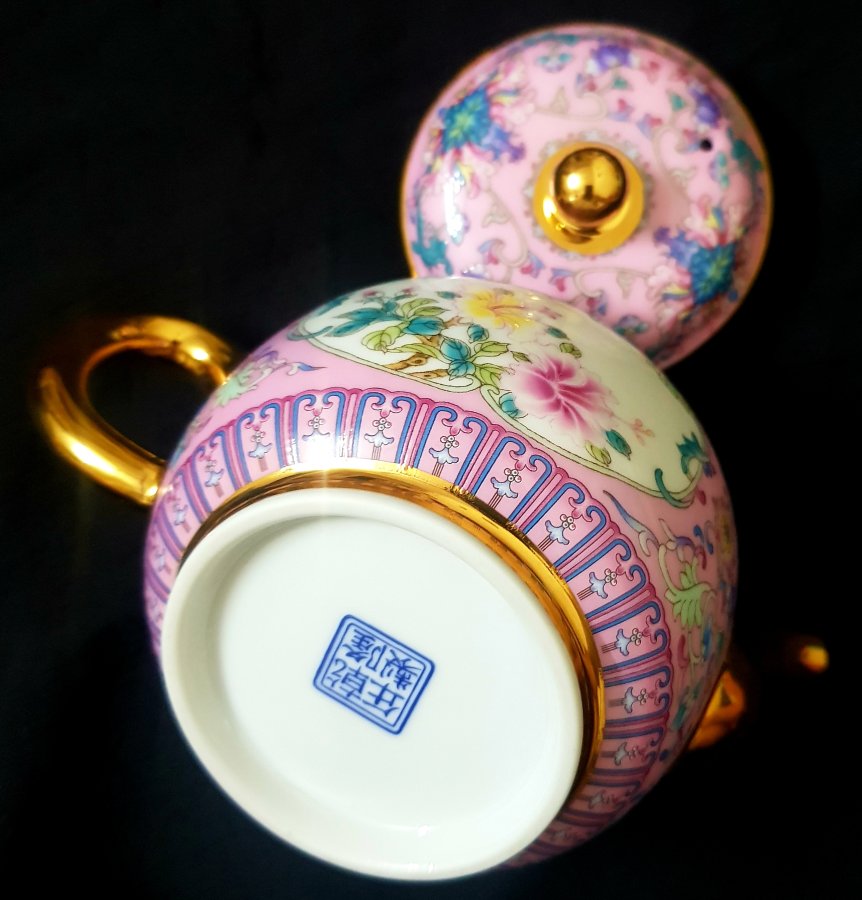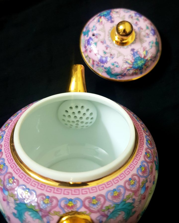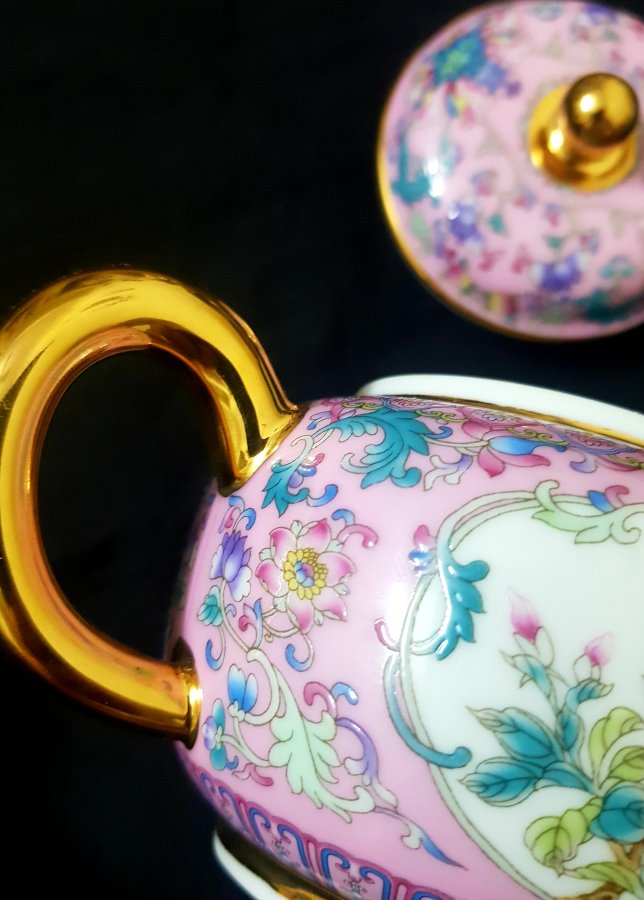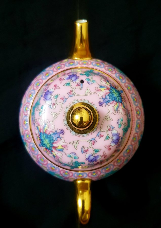 Kỹ thuật pháp lang trên sứ cùng với phương pháp dát vàng đã tạo nên chiếc ấm quý này. Ấm với các họa tiết pháp lang tỉ mỷ nổi trên bề mặt sứ , cùng với đó là lớp vàng được phù kín vòi quai và núm. xung quanh viền miệng ấm và viền nắp ấm cũng được phủ vàng đề tạo nên sự hài hòa cho dáng ấm cung đình này. Ấm dung tích khoảng 300ml. Lành lặn. GL1250k.