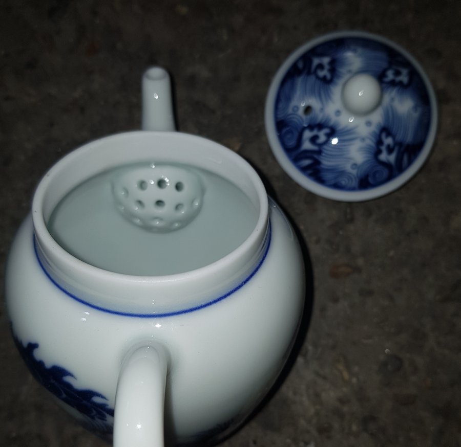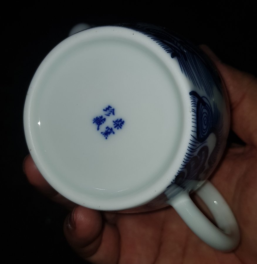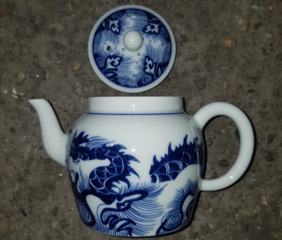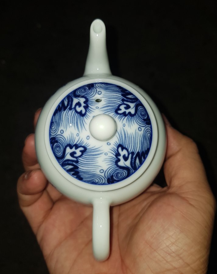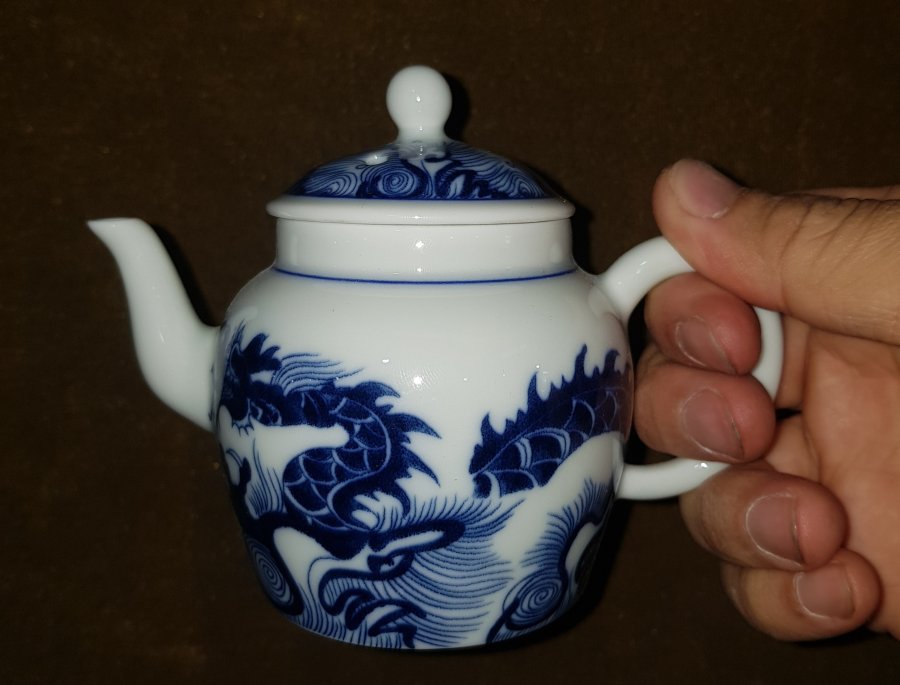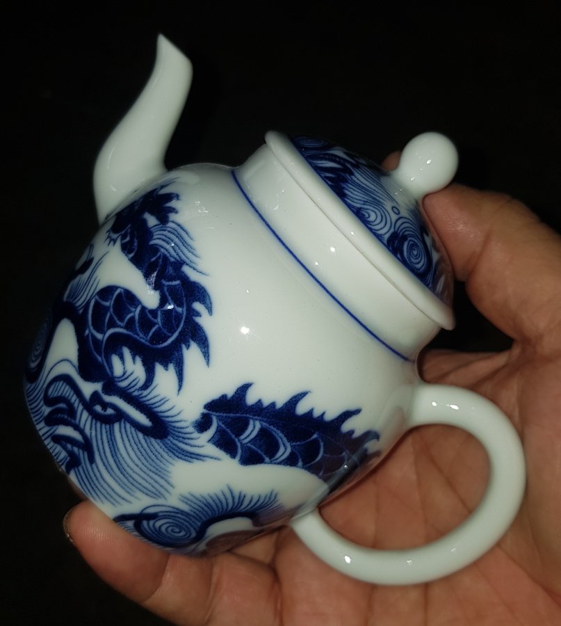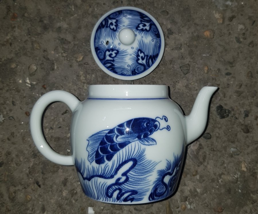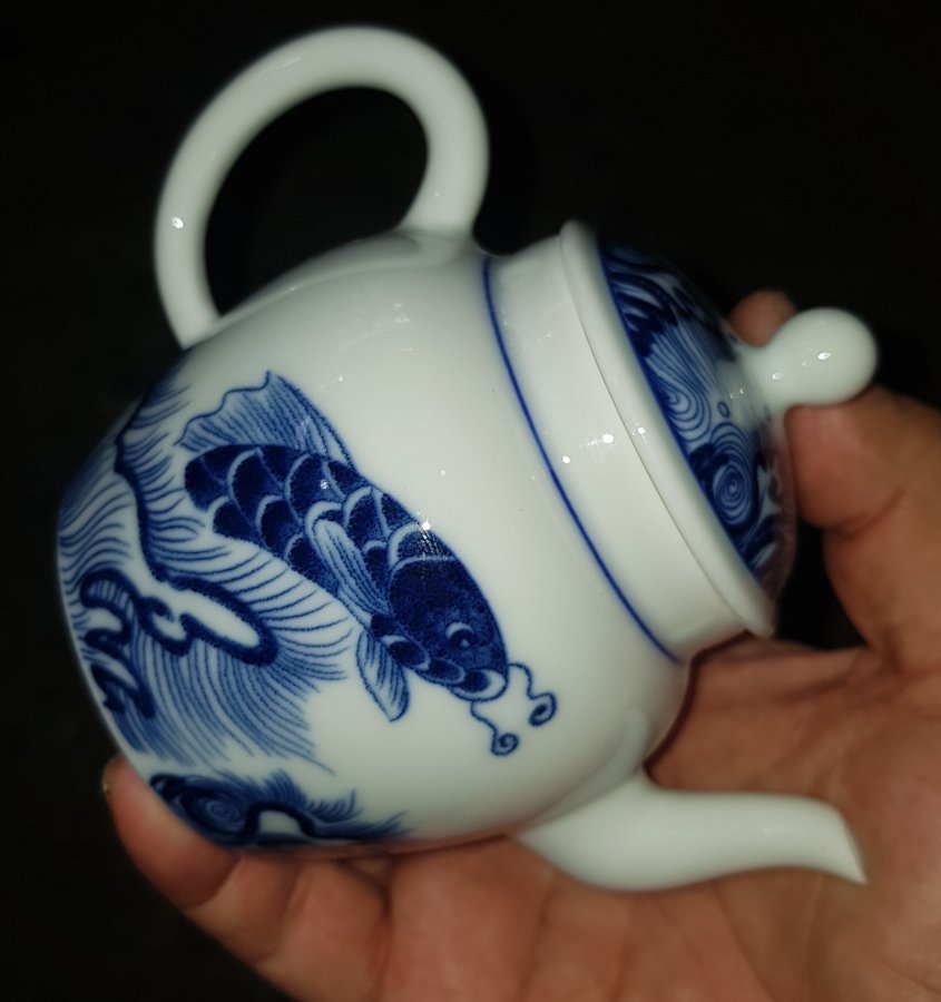 Ấm sứ men lam chàm hồi cao lanh tinh tuyển cốt sứ trong vắt với điển tích CÁ CHÉP VƯỢT VŨ MÔN HÓA RỒNG. Ấm dung tích khoảng 200ml. lành lặn. GL680k