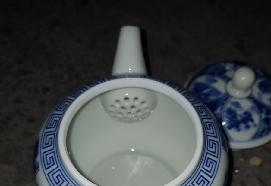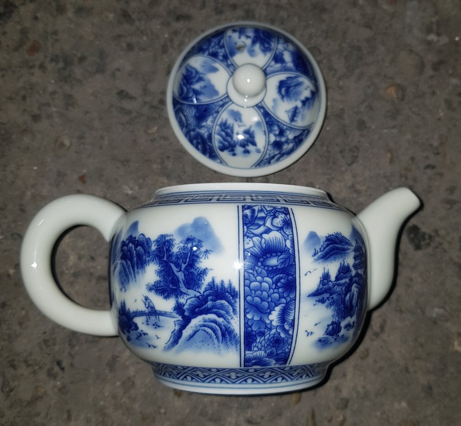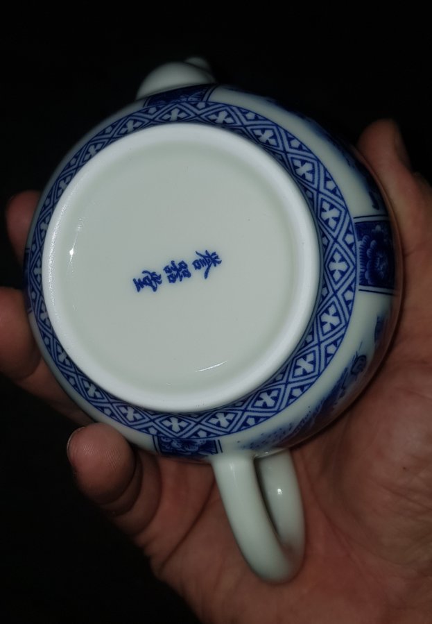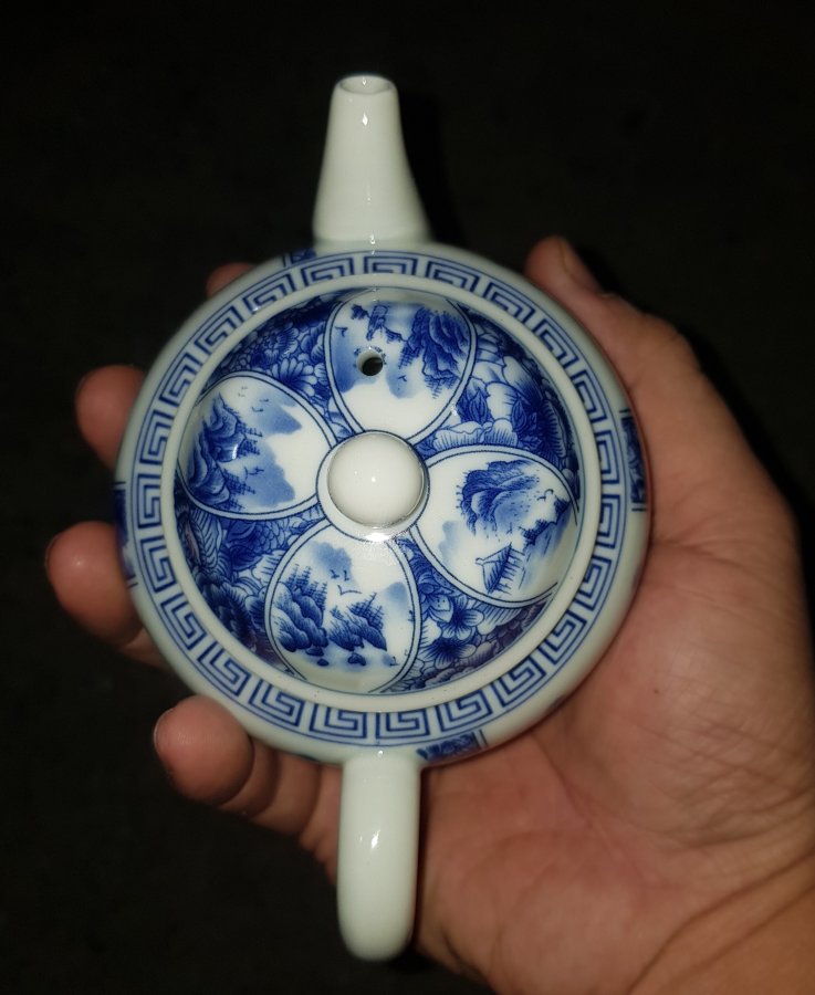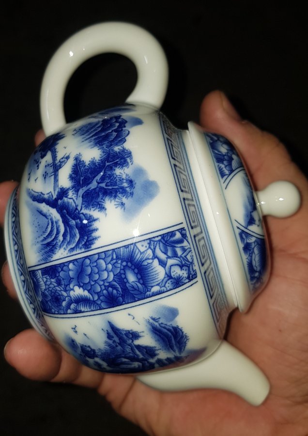 Ấm Thanh Hoa sứ men lam bổ ô cảnh sắc sơn thủy , ấm lọc tổ ông với dung tích khoảng 200ml. Ấm lành lặn. GL680k