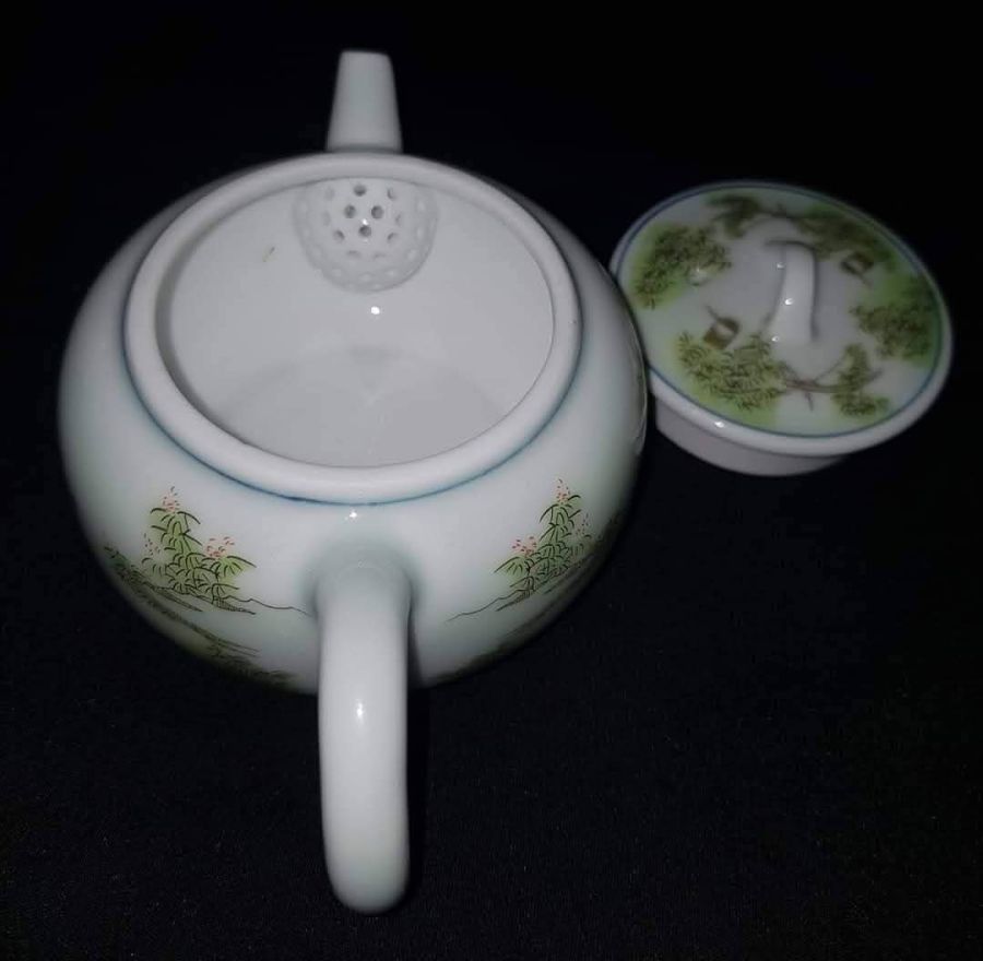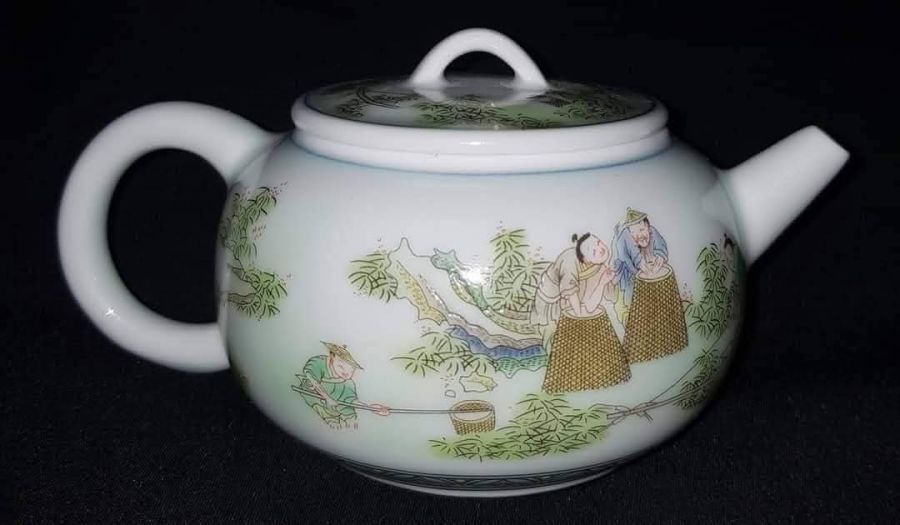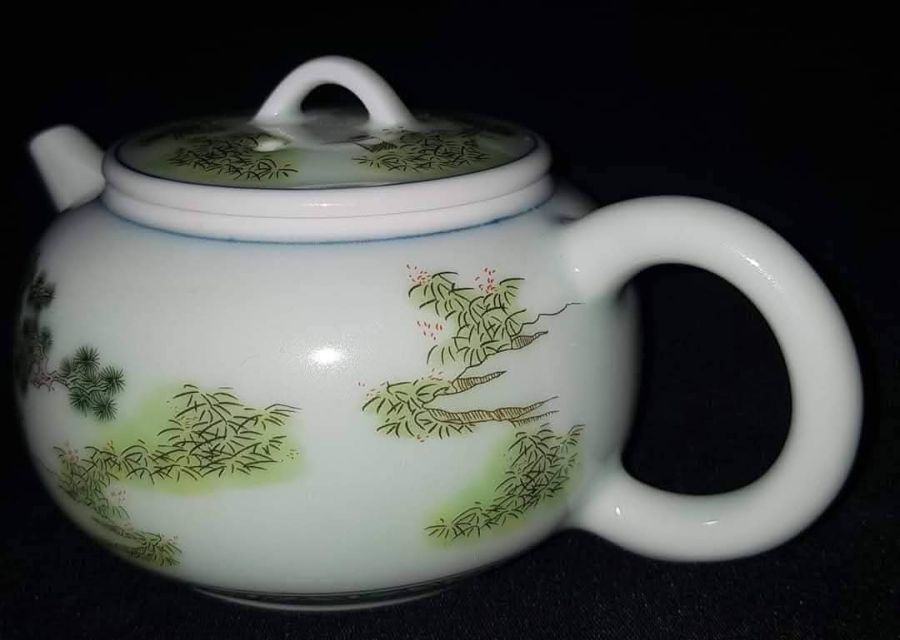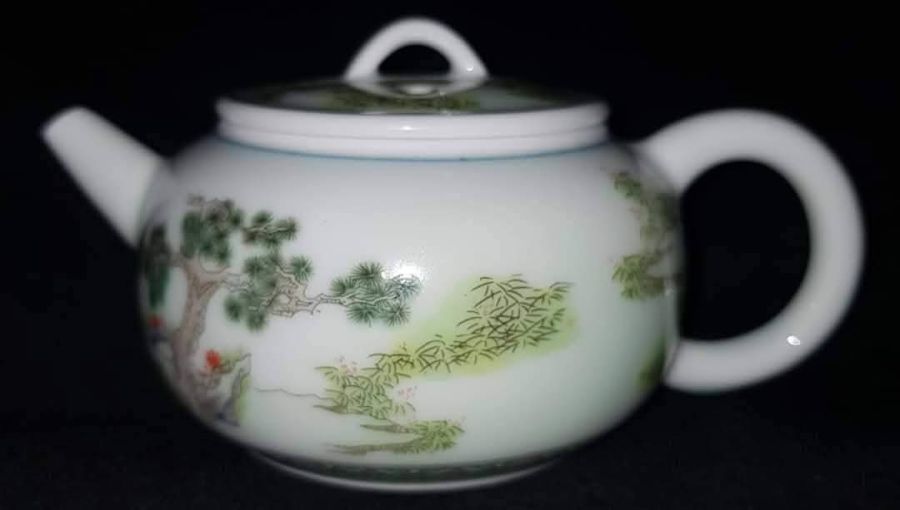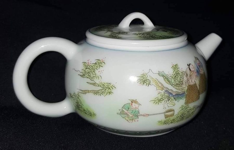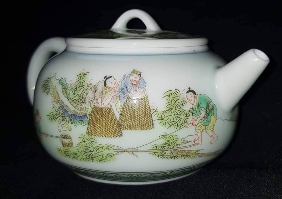 Ấm sứ mini dáng tang trống dung tích nhỏ chỉ khoảng 180ml. Một mặt diễn tả cảnh đánh bắt đất nước thái bình , mặt còn lại là thạch tùng đồ. GL790k
