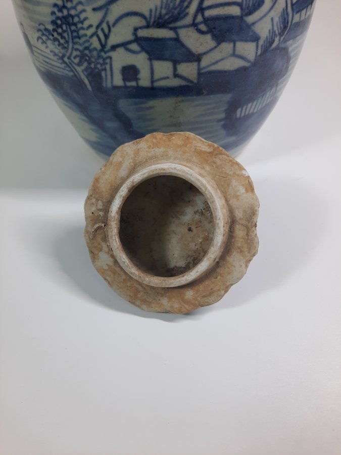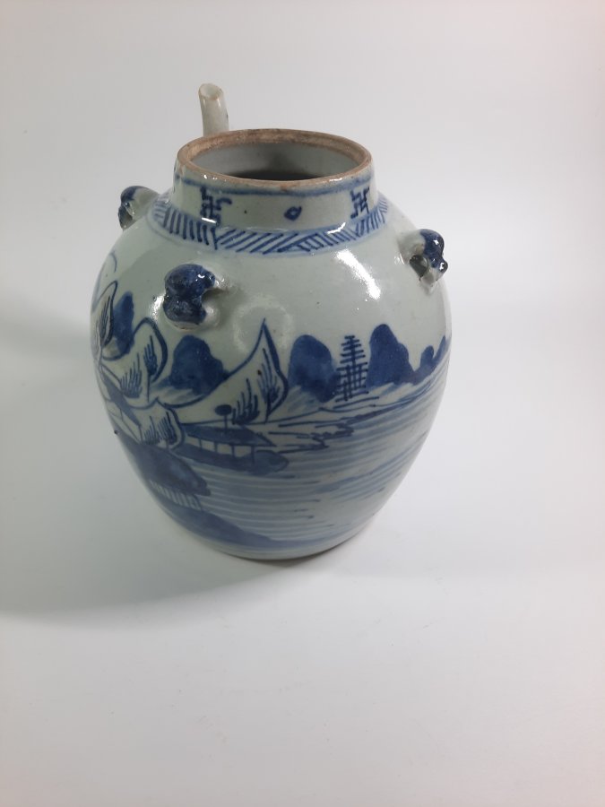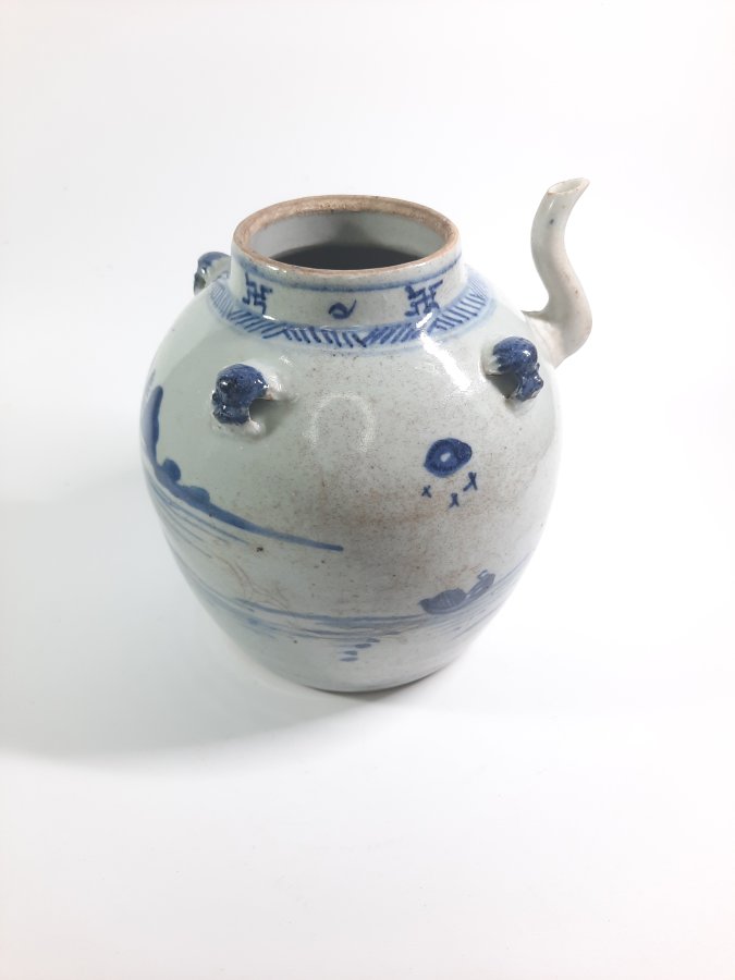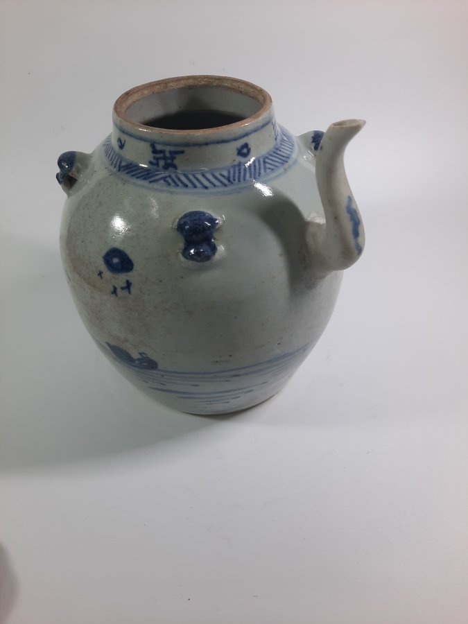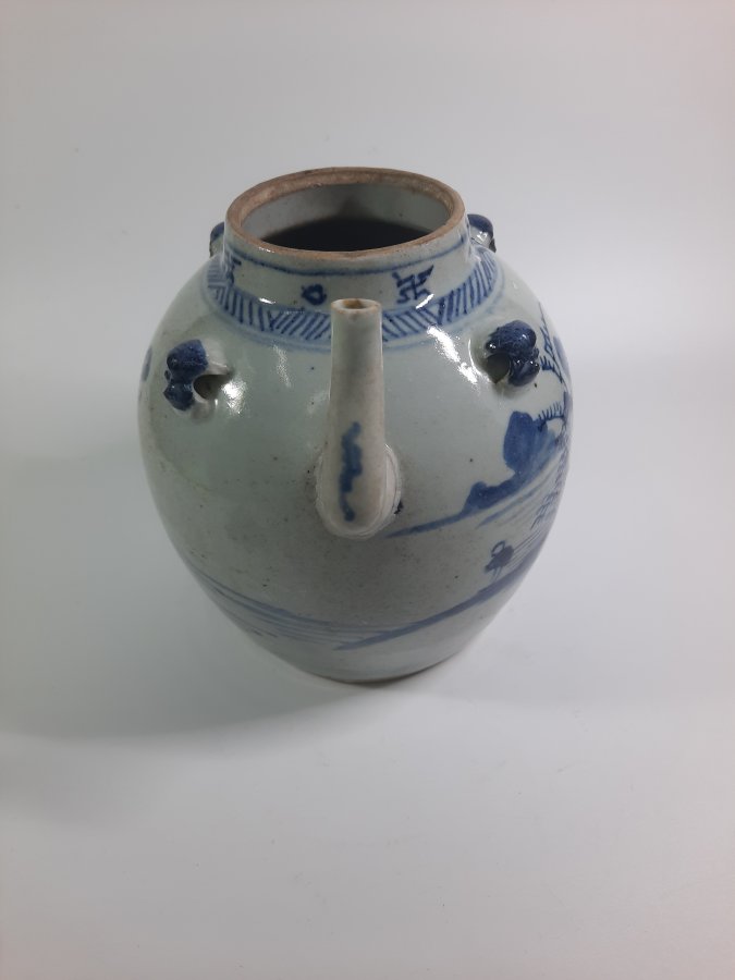 Ấm trà lớn, 3 quai mặt bượm vẽ đề tài sơn thủy có nhân vật.