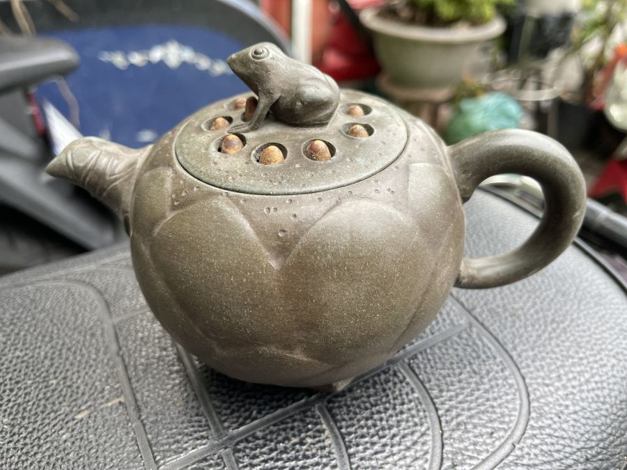 Ấm trà tử sa lục nê.con ếch ngồi trên bông sen .hạt sen đung đưa qua lại .