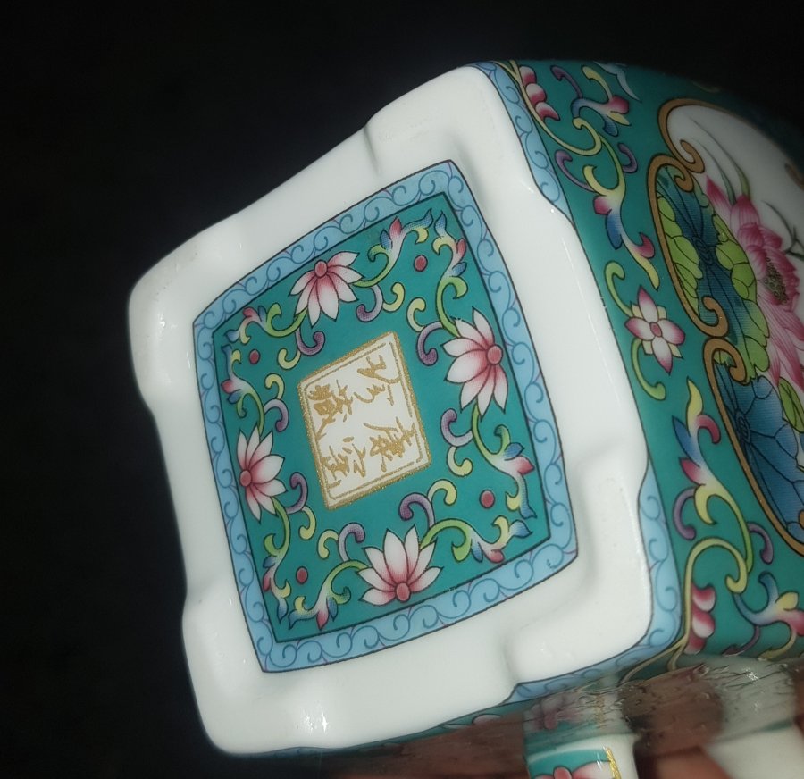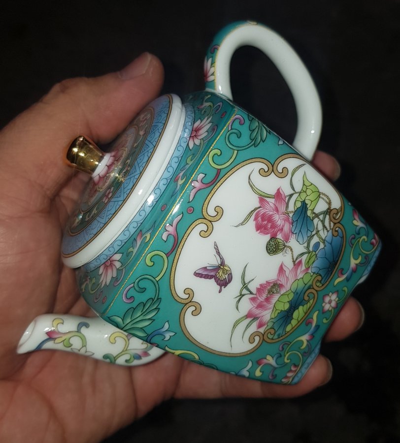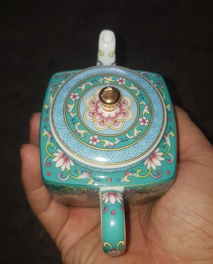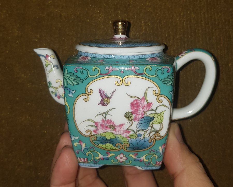Ấm tứ phương mini dung tích nhỏ chỉ khoảng 165ml. Ấm bổ ô hoa sen trên nền men gấm , với lọc cầu. Ấm lành lặn dáng hiếm thấy. GL680k