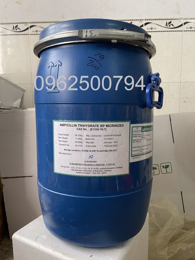 Ampicillin 98% là một kháng sinh thuộc nhóm β-lactam, có tác dụng chống lại vi khuẩn bằng cách ức chế quá trình tổng hợp vách tế bào vi khuẩn. Trong lĩnh vực thủy sản, ampicillin được sử dụng để điều trị các bệnh nhiễm khuẩn ở cá và các loài thủy sản khác do vi khuẩn nhạy cảm, như Aeromonas, Vibrio, và Edwardsiella gây ra. Những vi khuẩn này thường là tác nhân gây bệnh phổ biến, dẫn đến các vấn đề sức khỏe nghiêm trọng trong môi trường nuôi trồng thủy sản.