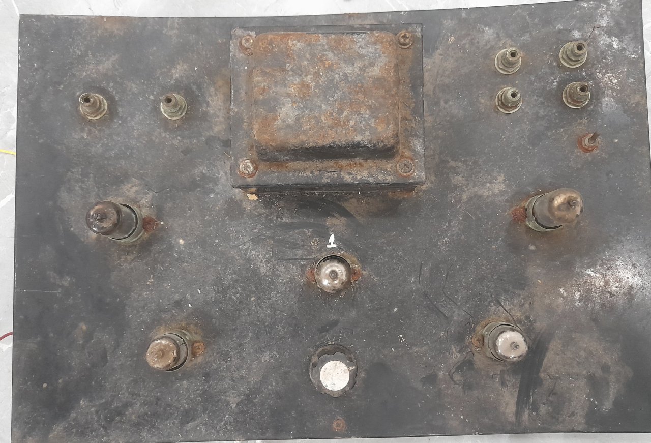 Mặt trên máy gồm nguồn, cọc âm vào, ra, núm âm lượng và 5 tubes gồm 2 tube 6AK6, 1 TUBE 5U4, 1 Tube 5754, 1 tube 6AK5...