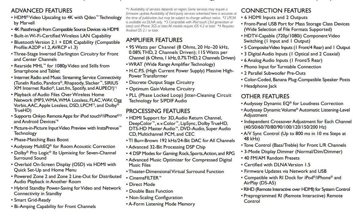 Amply 7.2 Onkyo TX-NR626 với công suất max 115w/kênh x 7 kênh và 2 sub điện, tương thích loa trở kháng 6ohm-16ohm, đẩy đủ công nghệ như HDMI 4K với giải mã TrueHD, DTS HDmaster, Dolby Digital plus v.v... có kết nối wifi, Lan, Bluetooth, usb chơi nhạc lossless qua usb, có Spotify, khiển app, internet tuner, radio đủ 108mhz v.v... máy xuất Mỹ điện thế 120v (khách cắm điện 100v hoặc 110v đều đc).