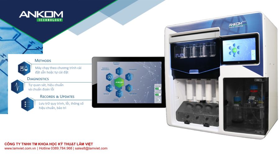 Máy phân tích tách chiết ANKOM FLEX sẽ loại bỏ các vấn đề hay phát sinh của phương pháp thủ công thông dụng bằng cách chạy tự động cho tất cả các pha của quá trình chuẩn bị mẫu