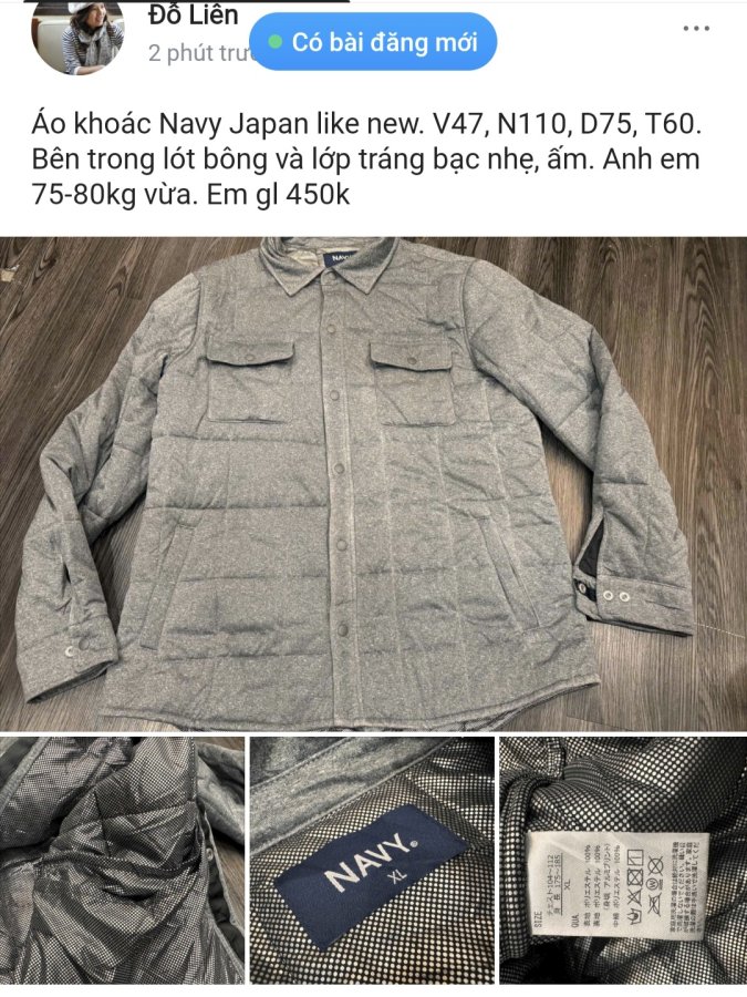 Áo khoác Navy Japan like new. V47, N110, D75, T60. Bên trong lót bông và lớp tráng bạc nhẹ, ấm. Anh em 75-80kg vừa. Em gl 450k