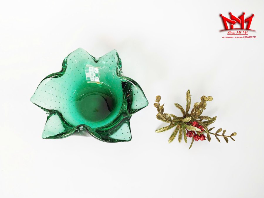 Art thủy tinh nghệ thuật Murano cổ điển màu xanh lá cây đậm, được làm thủ công và có hình dạng tự do, mang lại vẻ đẹp độc đáo.