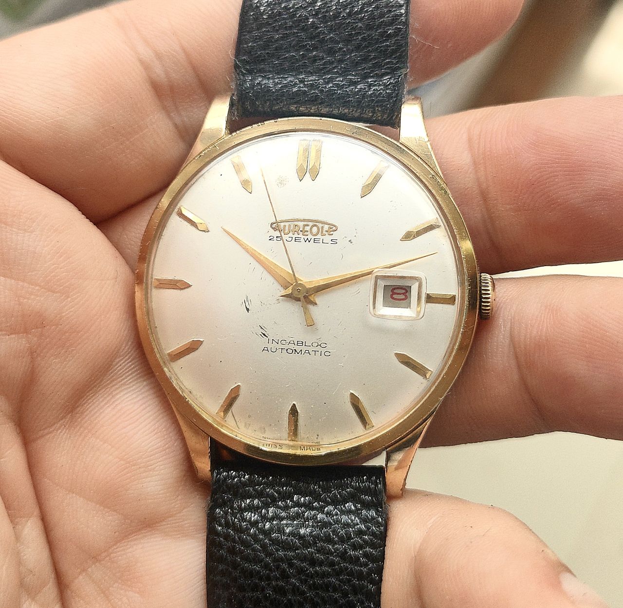Aureole Automatic 25 Jewels, zin nguyên củ, fom lên tay như Omega, máy vàng hồng hiếm chất lượng nhé với bộ lịch đỏ quanh năm. Size men 36 không đo núm