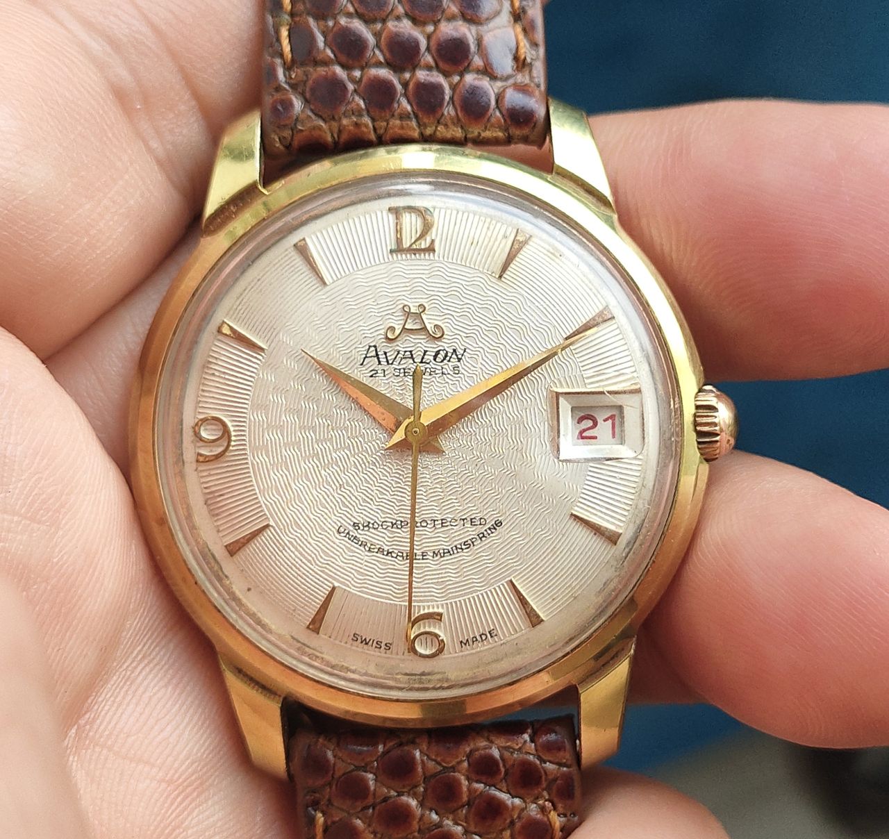 Avalon Swiss 21 Jewels, thương hiệu Thụy Sỹ, zin nguyên củ, mặt zin 2 lòng vân nổi tuyệt đẹp độc, máy balance gai hồng chất lượng. Size to hiếm 36 không đo núm