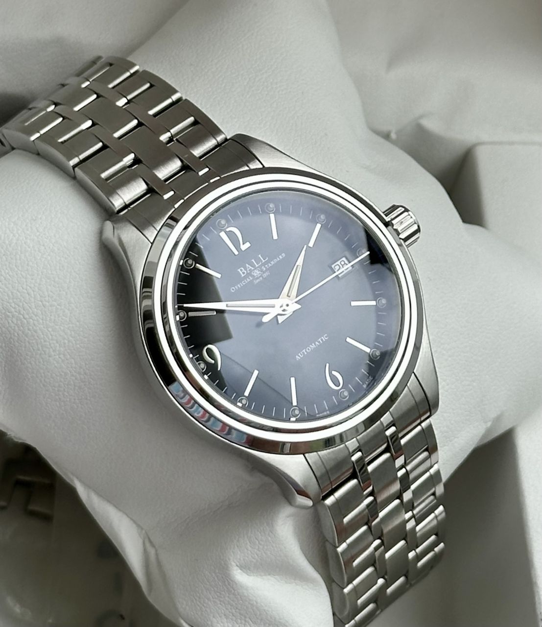 Chiếc đồng hồ tự động cao cấp Thuỵ Sỹ BALL Trainmaster StreamlinerNM1060D chính hãng. Sử dụng máy tự động BALL 25 chân kính nguyên zin chạy chuẩn, chất liệu Stainess Steel 316L, kính Saphire chống xước, mặt số đen cực ngầu vs cọc số dạng ống phát quang siêu độc đáo . Size 39mm, nguyên zin rất đẹp. Chiếc này mua mới ~ 50Tr, e giao lưu chỈ ĐÃ BÁN