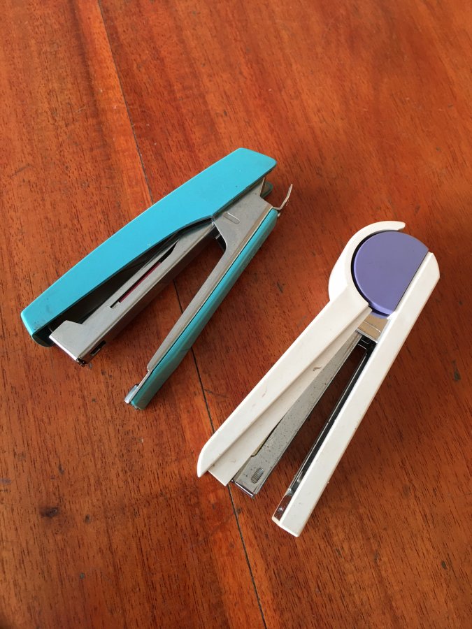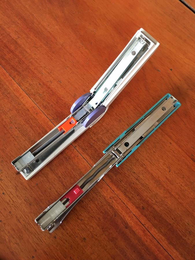 Bán cặp bấm ghim Japan còn như mới, hoạt động hoàn hảo. Cây trắng Wevox no.10, cây xanh Max hd-10d, cả 2 đều là hàng xưa Japan, sử dụng ghim thông dụng bán nhiều ở tiệm văn phòng phẩm