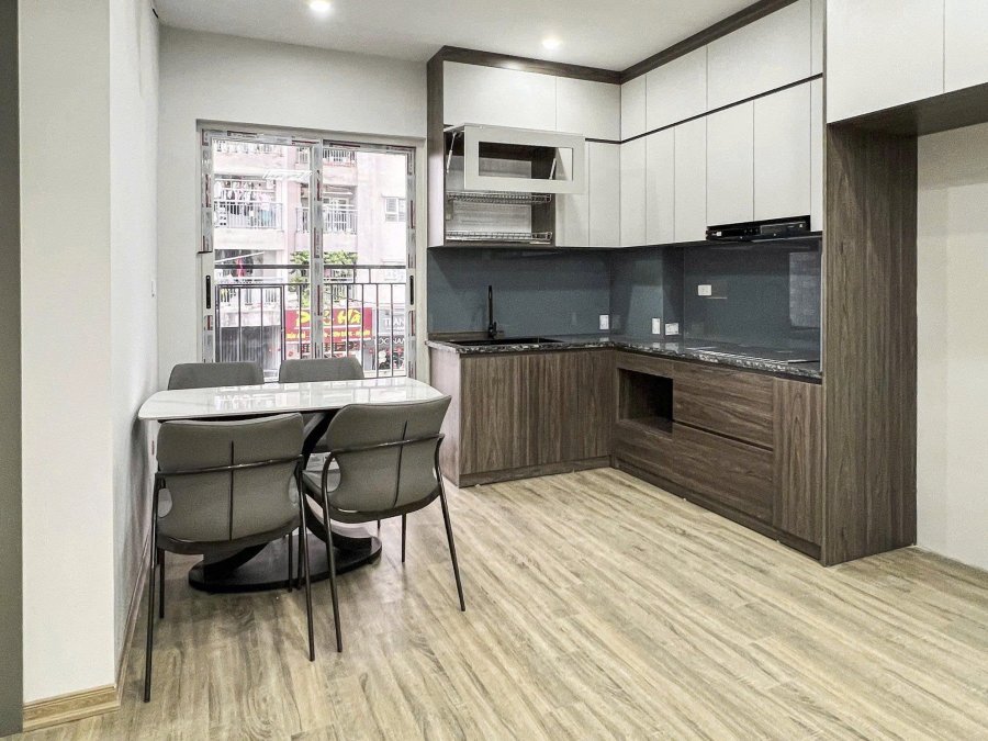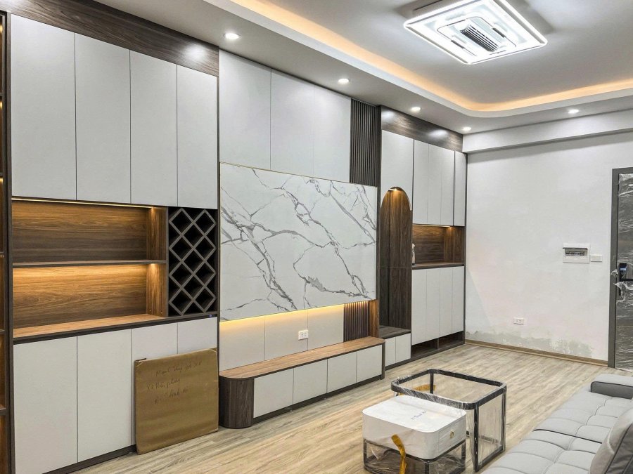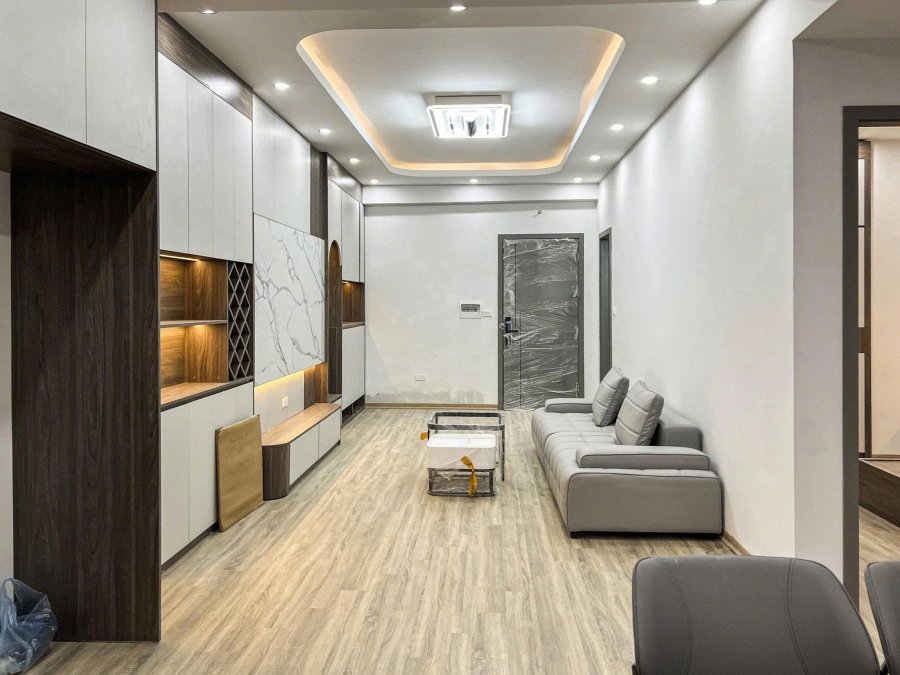 Nội thất: Tủ bếp, bếp từ, hút mùi, sofa, bàn trà, bàn ăn, 2 điều hòa, nóng lạnh, giường tủ 2 phòng ngủ, tủ giày; 2 nhà vệ sinh đã ốp đá mới cao cấp, vòi hoa sen hiện đại.