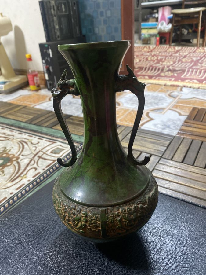 Em bán chiêc bình khá hiếm hàng kỷ niệm chất liệu đồng rát cổ kính, hàng siê tầm giờ cân tiền bán ,bác nào cân chơi Alo