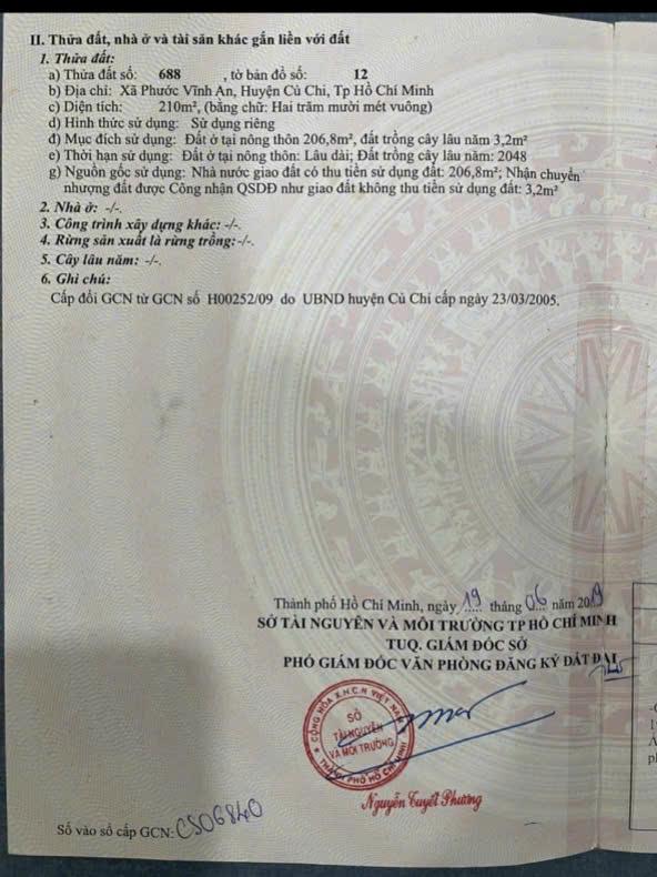 Cần bán lô đất 1/ tỉnh lộ 8. xã Phước Vĩnh AnDt 8,5x25 full thổ. Sổ hồng riêng. Quy hoạch dân cư hiện hữuGiá 3,2 tỷLh 0977388511 zalo