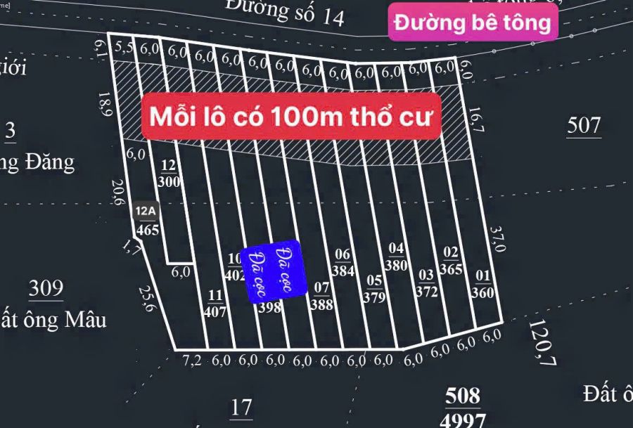- Diện tích: 6*60m2, sẵn 100m2 thổ cư