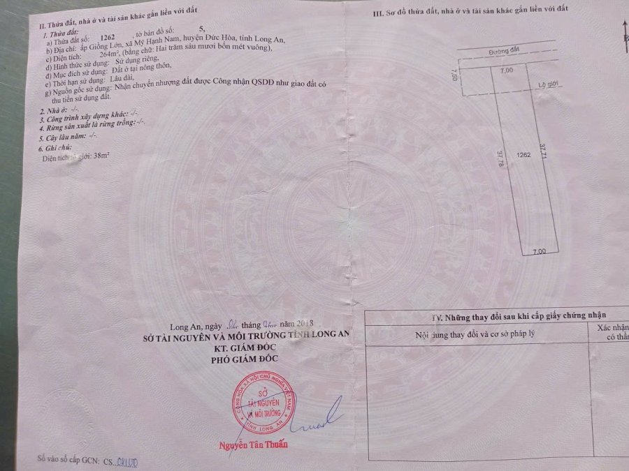 Bán lô đất thổ shr ,tại xã Mỹ Hạnh Nam , Đức Hòa Long AnDiện tích 7 X 37 , full thổGiá 1ty670trLH 0977388511 zalo