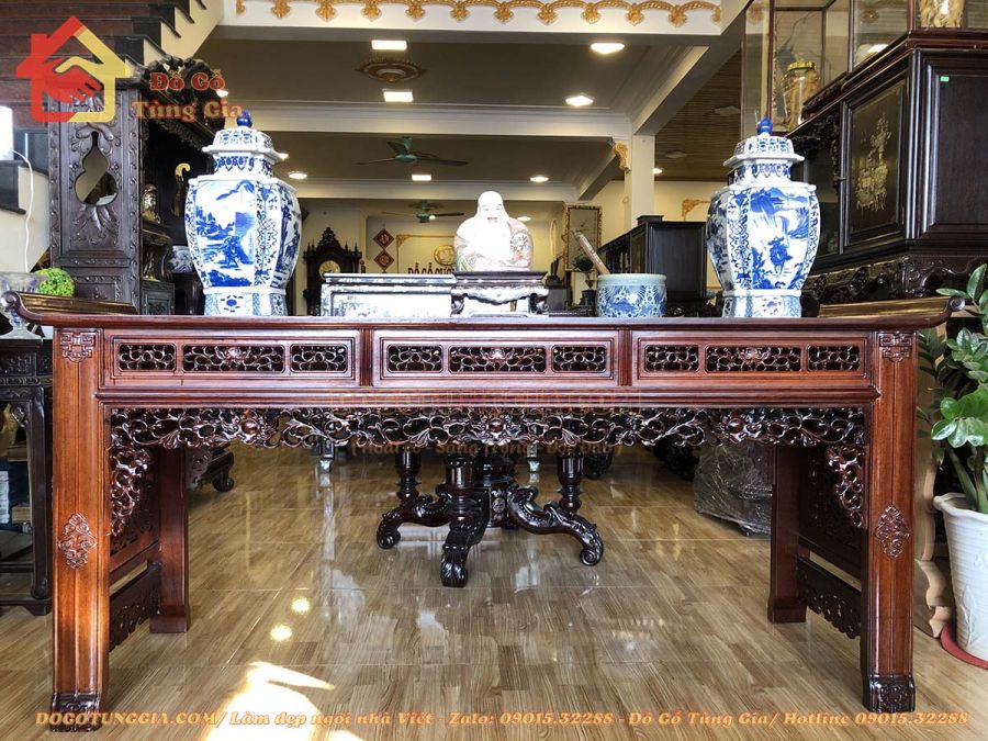 Với nhiều mẫu bàn gỗ chạm cúc hóa kiểu dáng đa dạng để phù hợp cho không gian phòng khách, phòng làm việc, phòng trà, phòng thờ… Cơ sở Đồ Gỗ Tùng Gia chuyên làm hàng đặt theo kích cỡ, màu sắc để phù hợp với gian nhà theo yêu cầu của khách hàng.