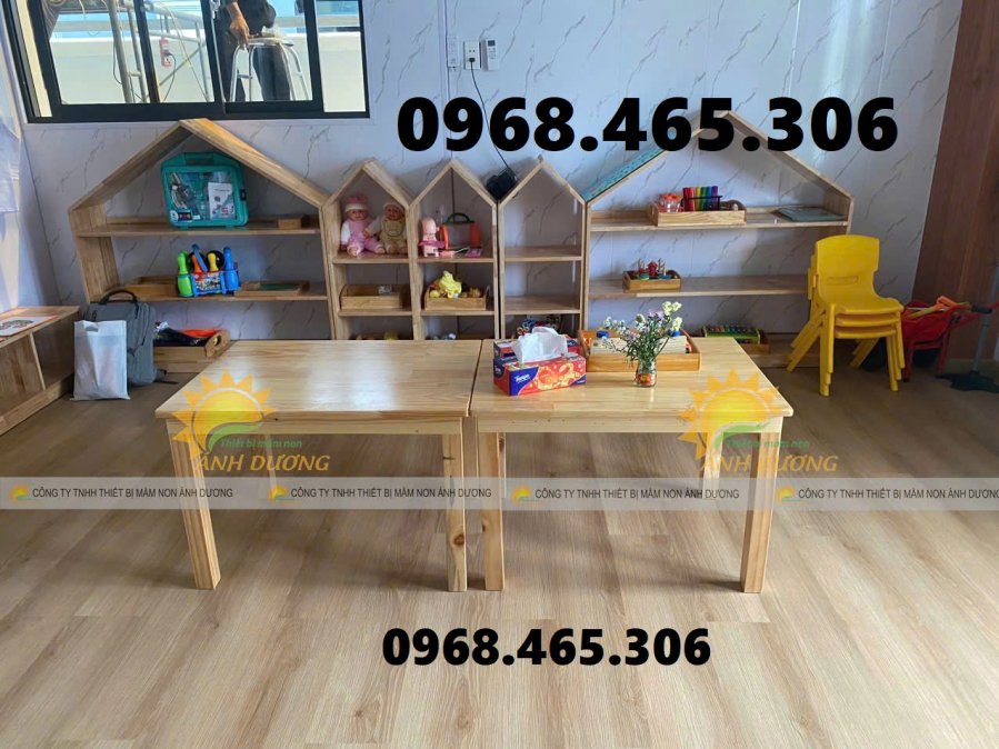 Bàn mầm non gồm mặt bàn được sản xuất từ gỗ cao cấp , chân bàn chịu lực được và mặt bàn được làm từ gỗ cho cảm giác sử dụng tốt hơn, sạch hơn, không bám bụi, dễ lau chùi, vệ sinh.