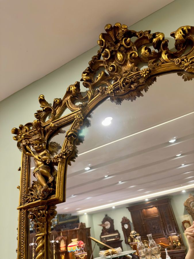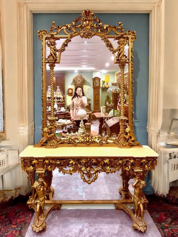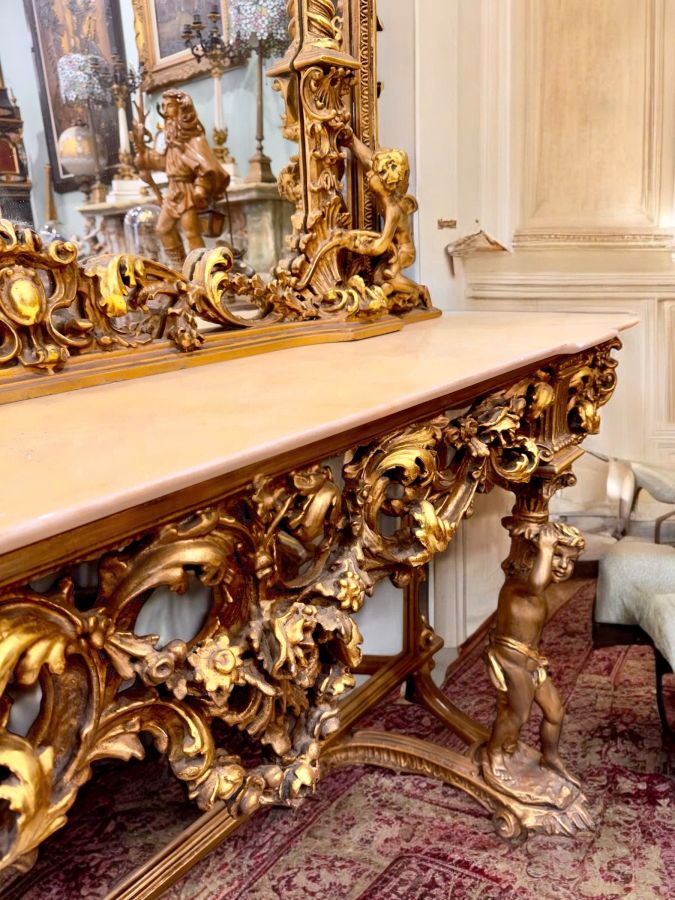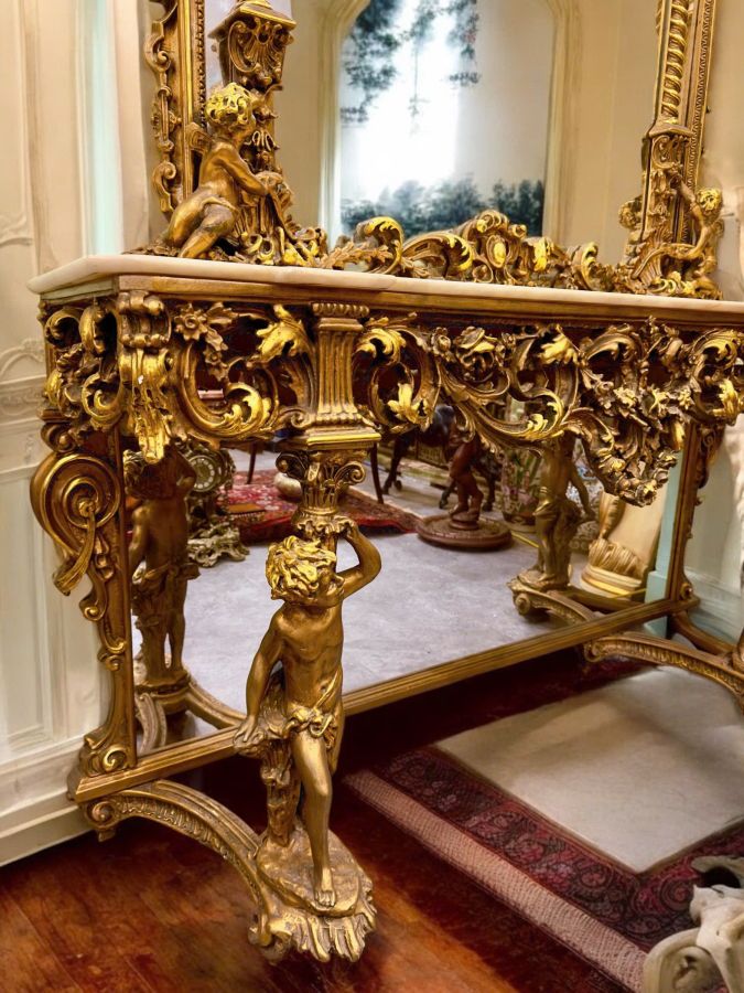 Mặt bàn bằng đá cẩm thạch có thể tháo rời. Tổng thể có 6 tượng thiên thần cùng với lối chạm khắc cực tinh xảo.
