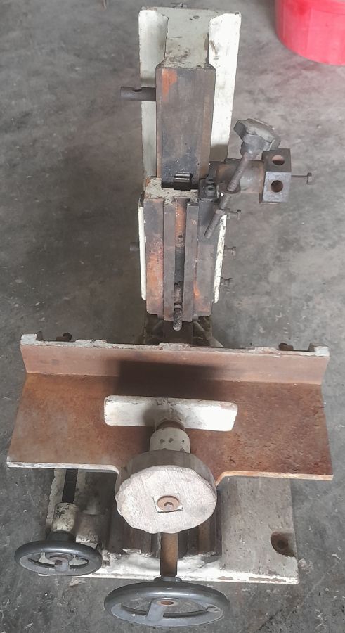Tình trạng.  Bộ khung gồm chân đế + giá kẹp cụm mô tơ & chấu kẹp mũi  có thể di chuyển lên xuống biên độ khoảng 30cm + bàn kẹp phôi có thể di chuyển phải- trái khoảng 36cm + di chuyển trước- sau khoảng 20cm. Các bàn trượt vẫn trượt tốt, êm, ít dơ lắc.